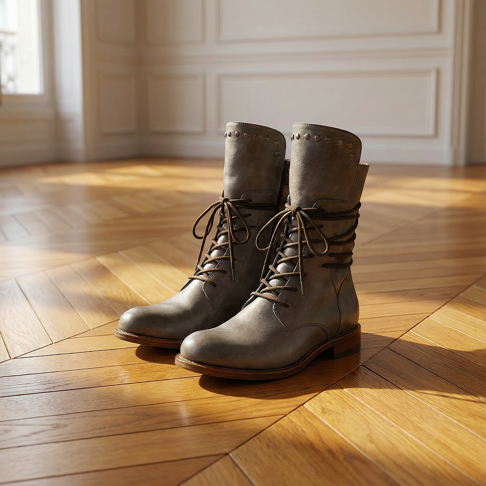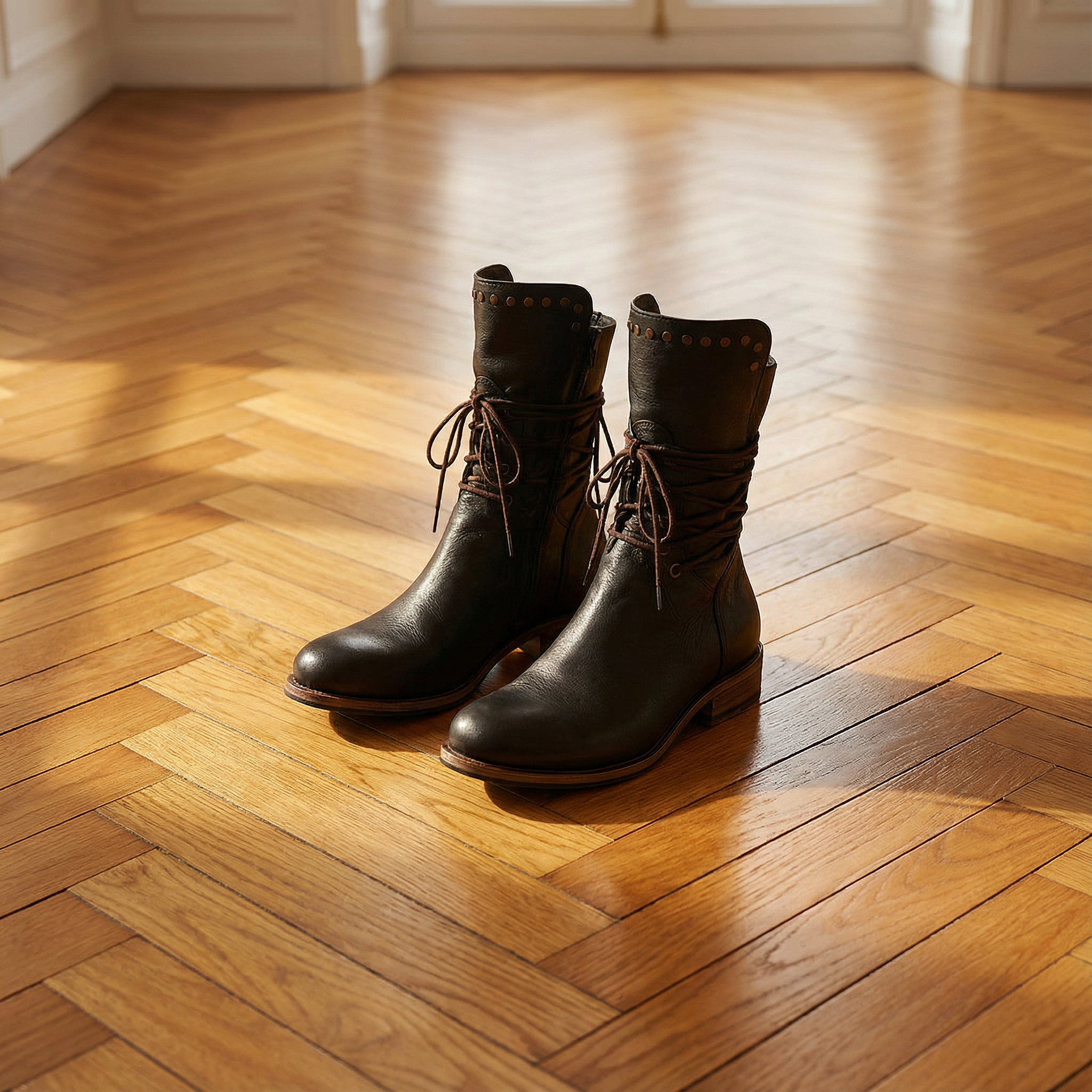 Women's mid-calf boots with upper and rear lace-up closure with metal eyelets. Features studded detail around cuff, round toe, and low stacked wood-effect block heel. Smooth finish with panelled construction. Suitable for casual wear, everyday outfits, autumn and winter styling, or vintage-inspired looks.