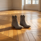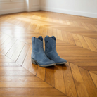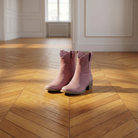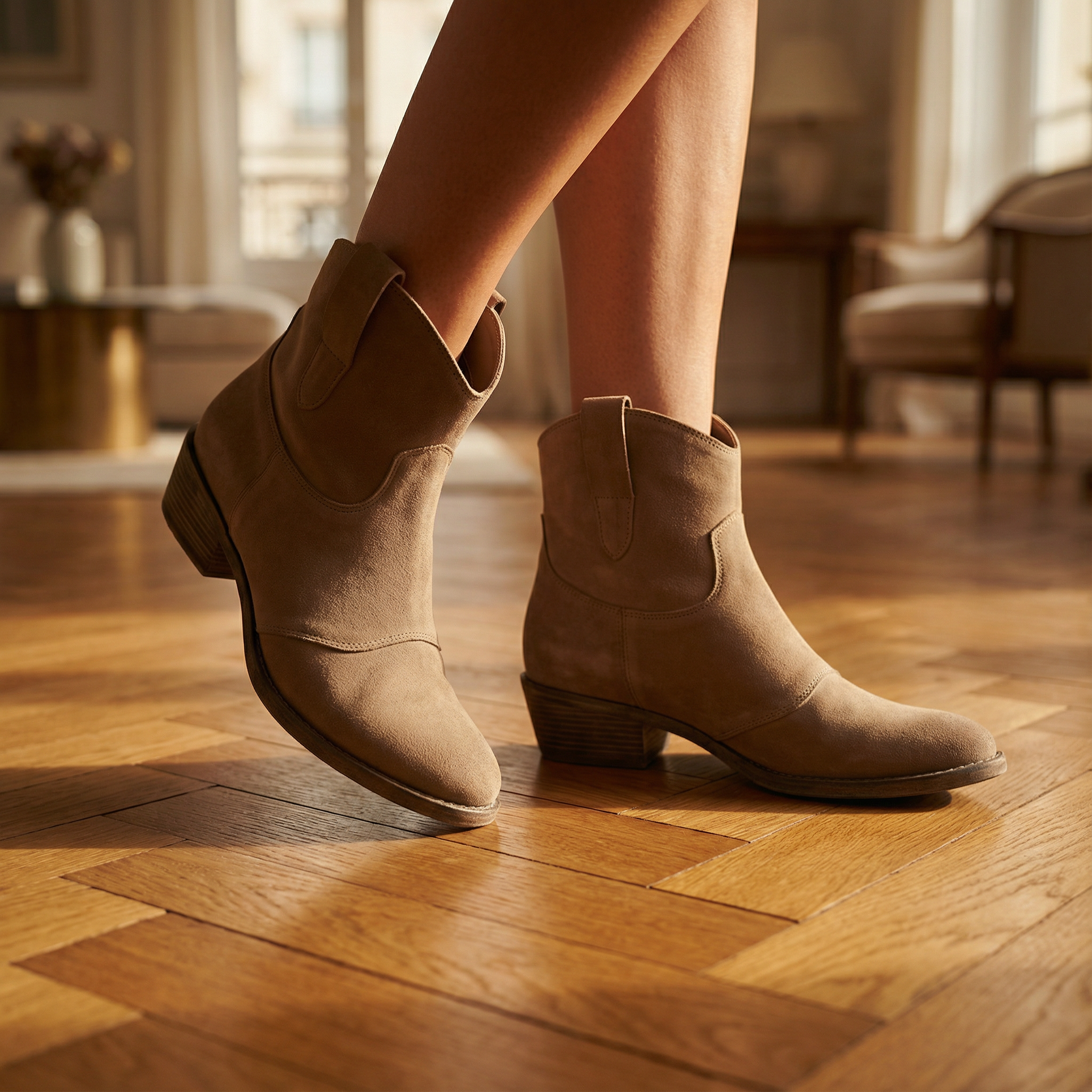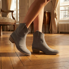Women's western-style ankle boots with suede-style upper and traditional cowboy boot silhouette. Features pointed toe, pull tabs at top, decorative stitched panel detailing, and low stacked block heel. Pull-on entry with notched collar. Suitable for casual wear, everyday outfits, western-inspired looks, or pairing with jeans, dresses, or skirts.
