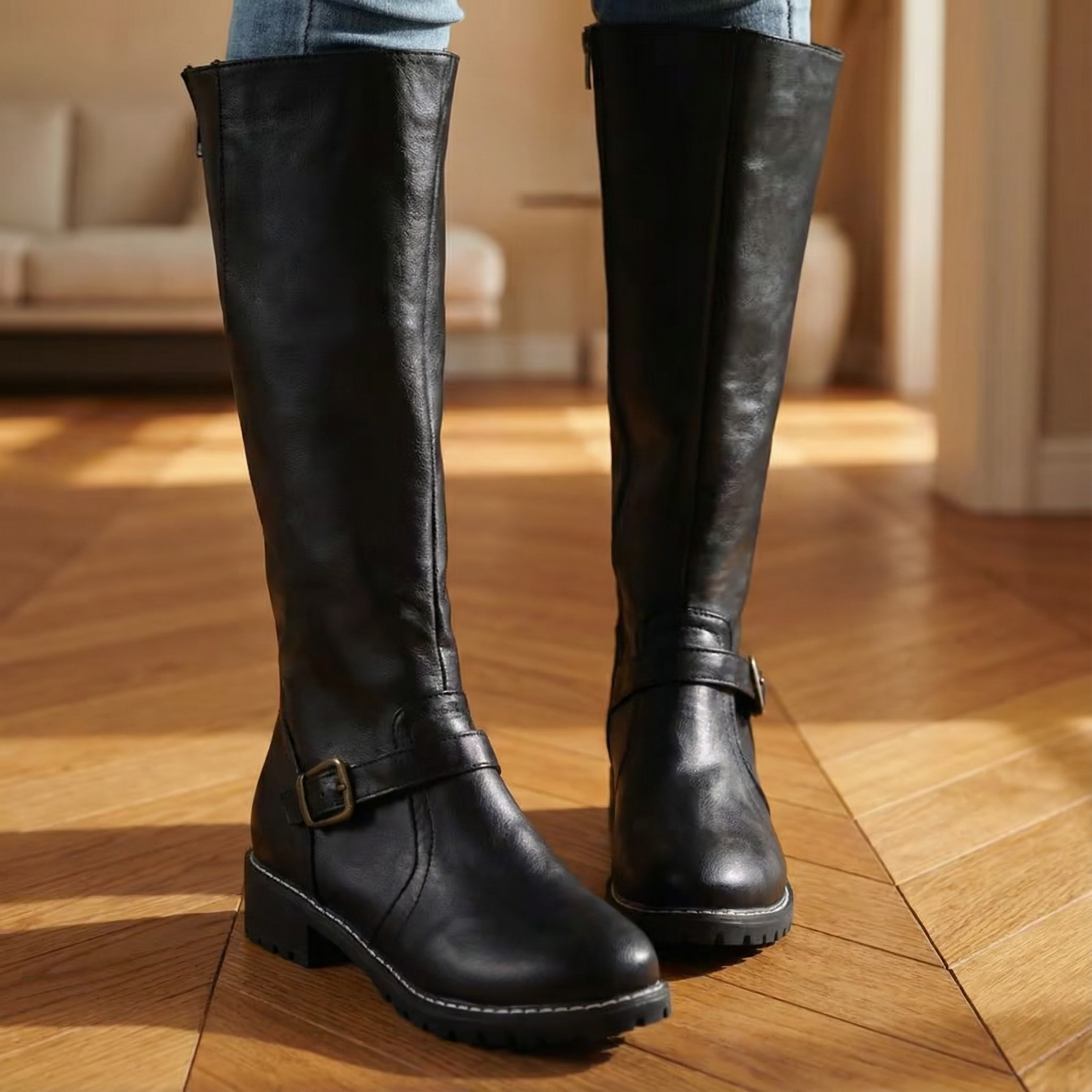 Women's knee-high boots with upper and wrap-around ankle strap with brass buckle detail. Features round toe, side zipper closure, stacked block heel, and chunky lug sole with textured rubber outsole. Contrast welt stitching at sole. Suitable for casual wear, everyday outfits, autumn and winter styling, or equestrian-inspired looks.