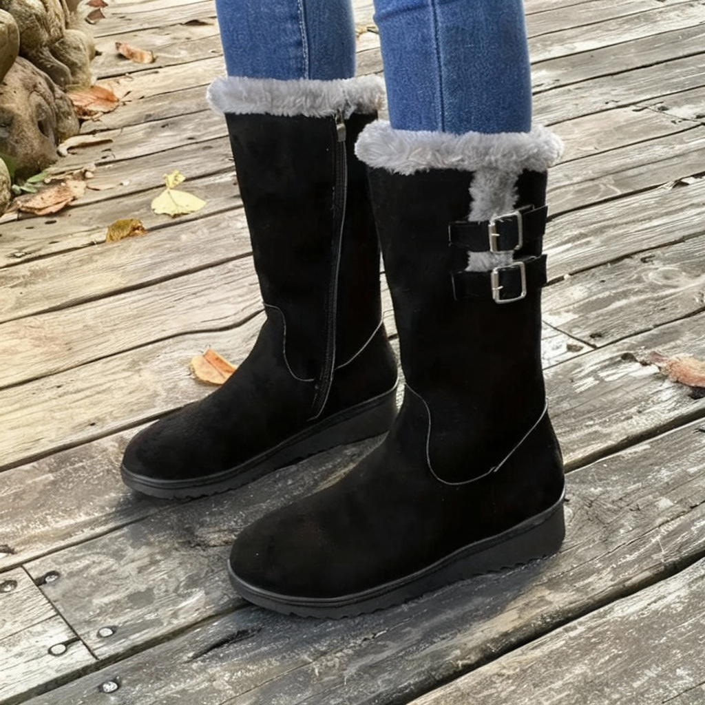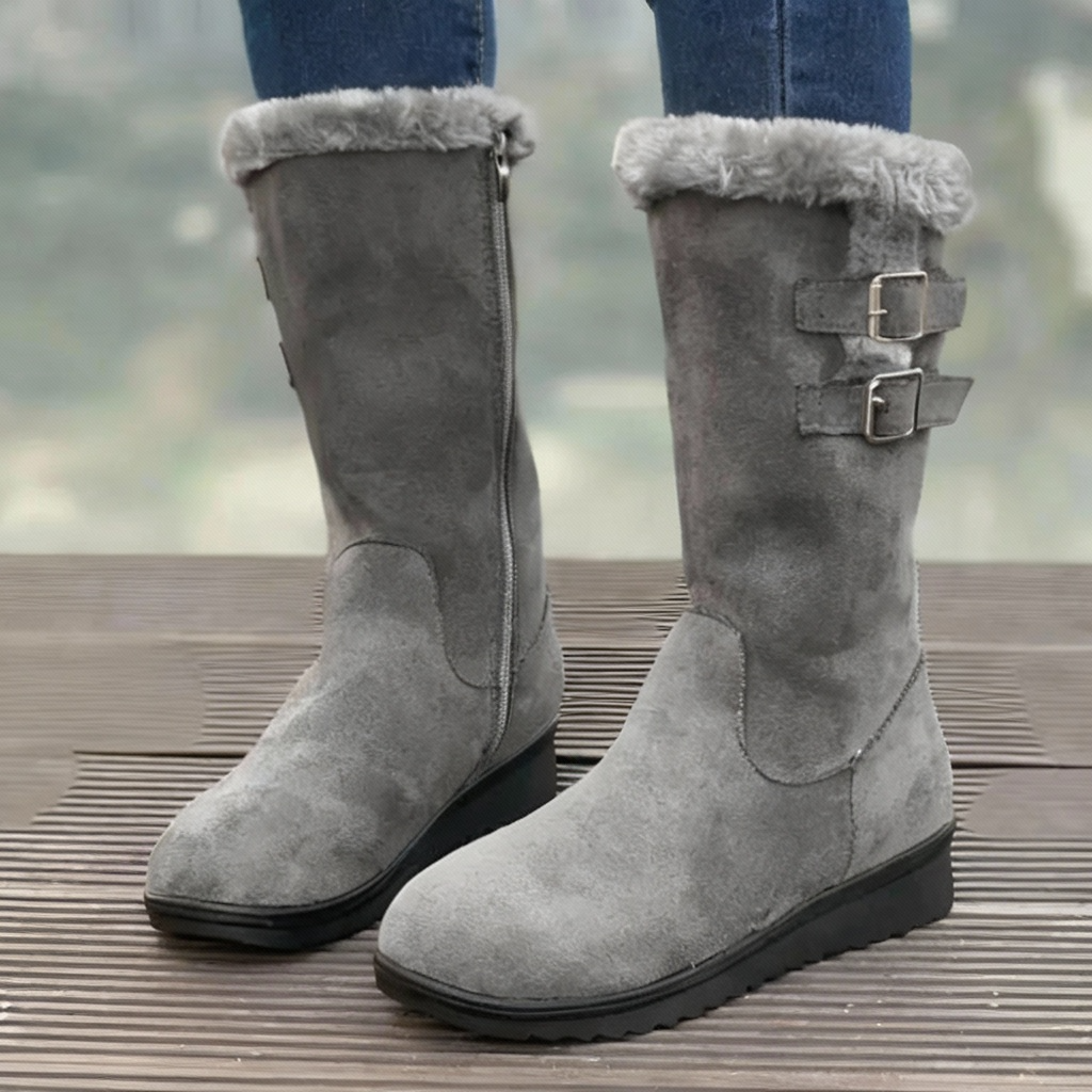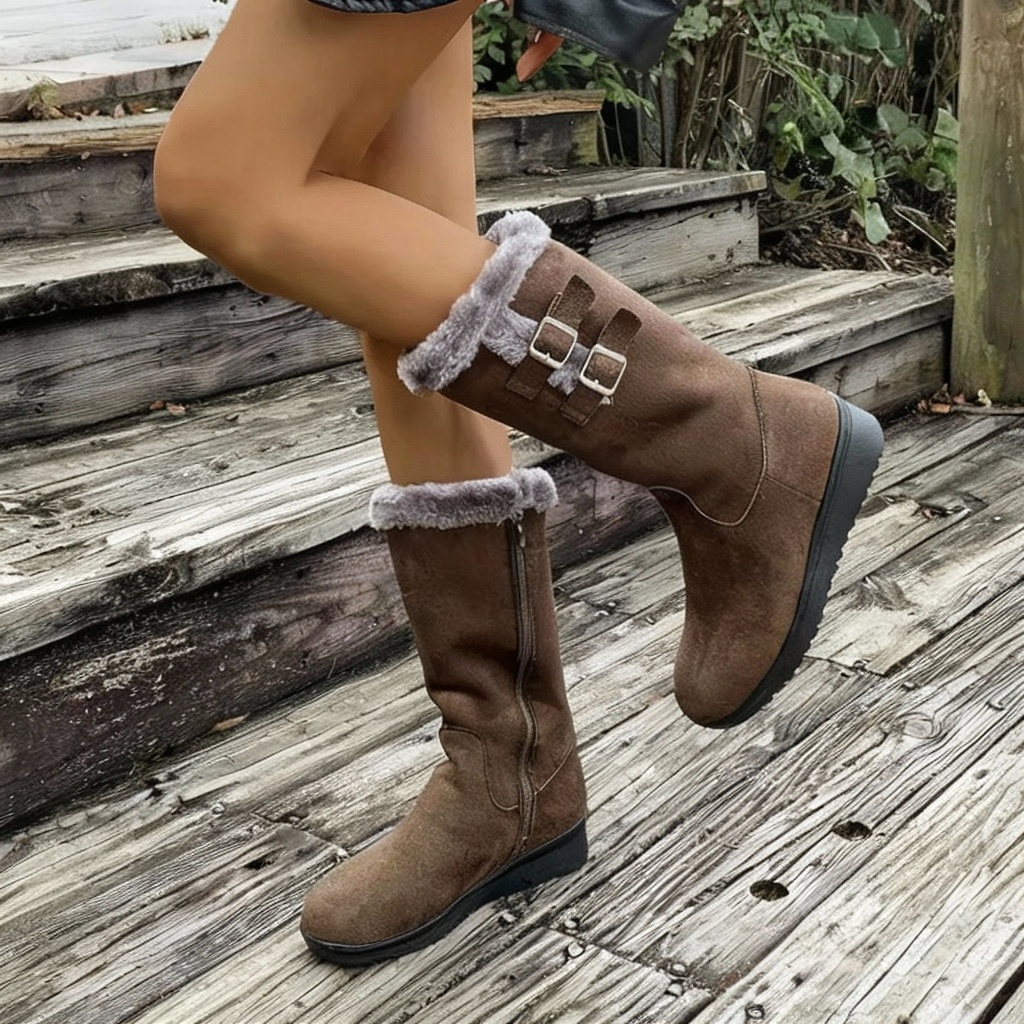 Women's mid-calf boots with suede-style upper and faux fur cuff lining. Features double buckle strap detail on outer side, side zipper closure, round toe, and flat platform sole with textured rubber outsole. Suitable for autumn, winter, cold weather, or casual everyday wear.