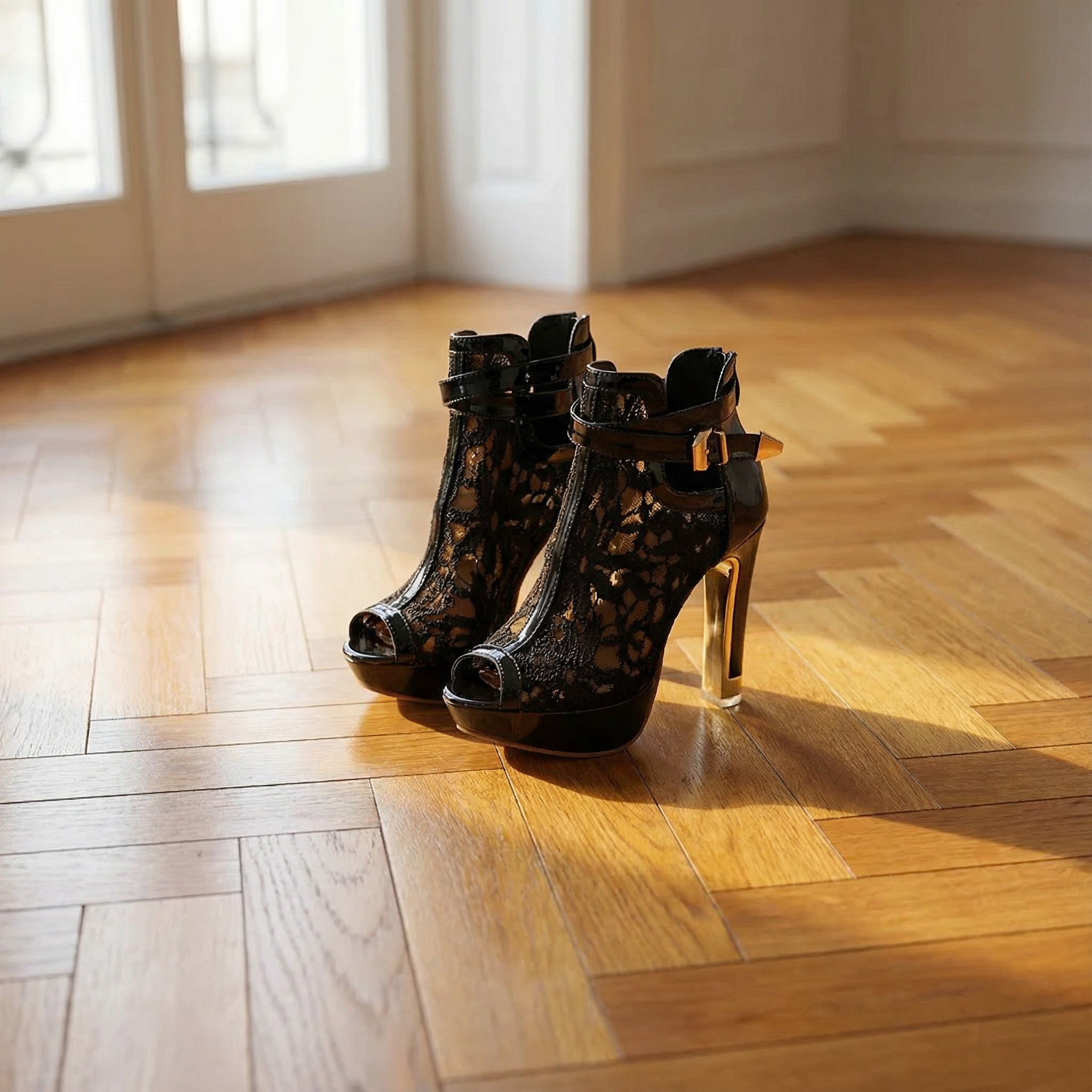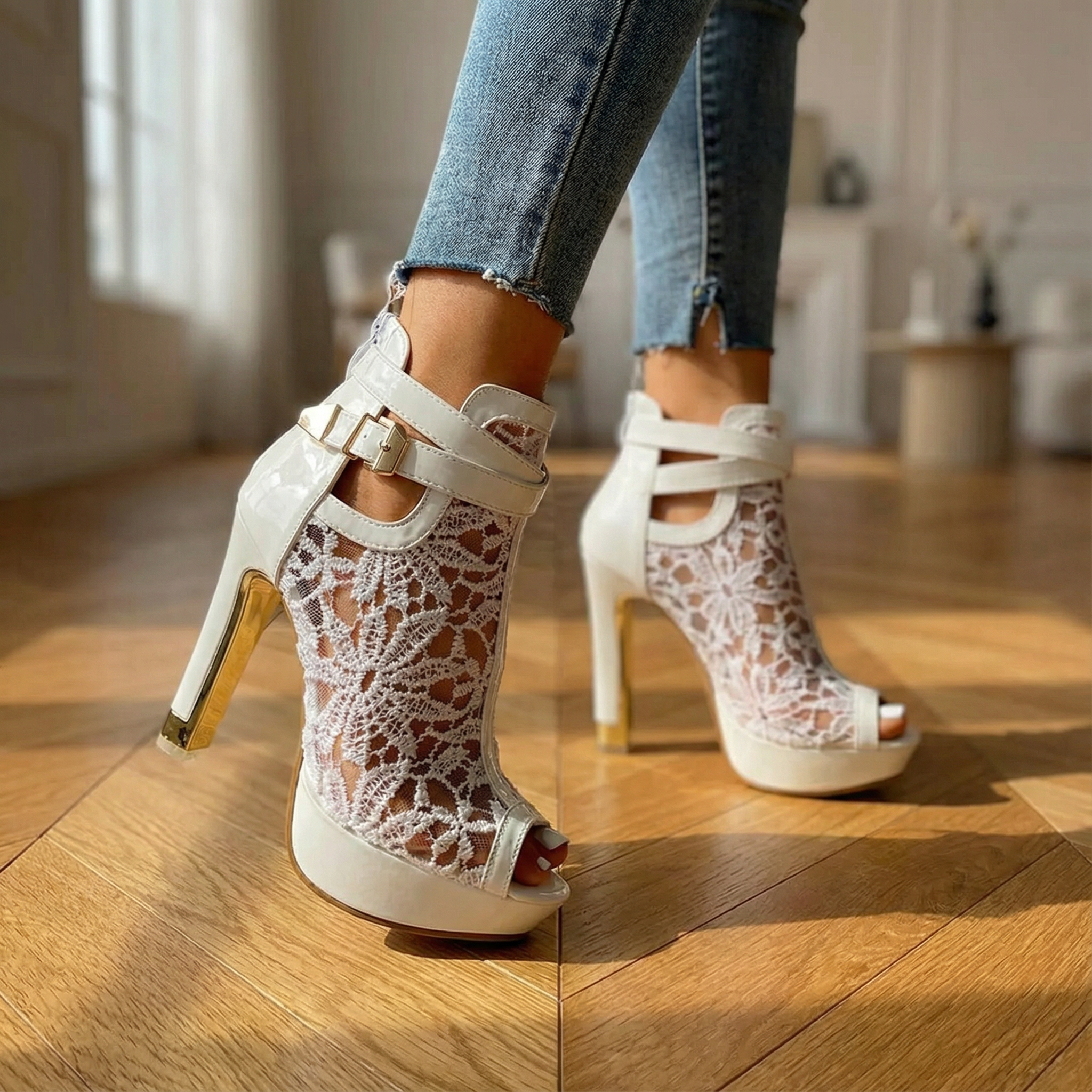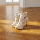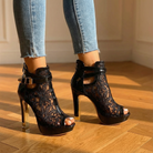Women's peep toe platform heels with lace upper and trim. Features embroidered floral mesh detail, adjustable buckle strap, stiletto heel approximately 4.4 inches, platform base approximately 1 inch, cushioned insole, and rubber sole. Suitable for evening wear, special occasions, or dressy outfits.