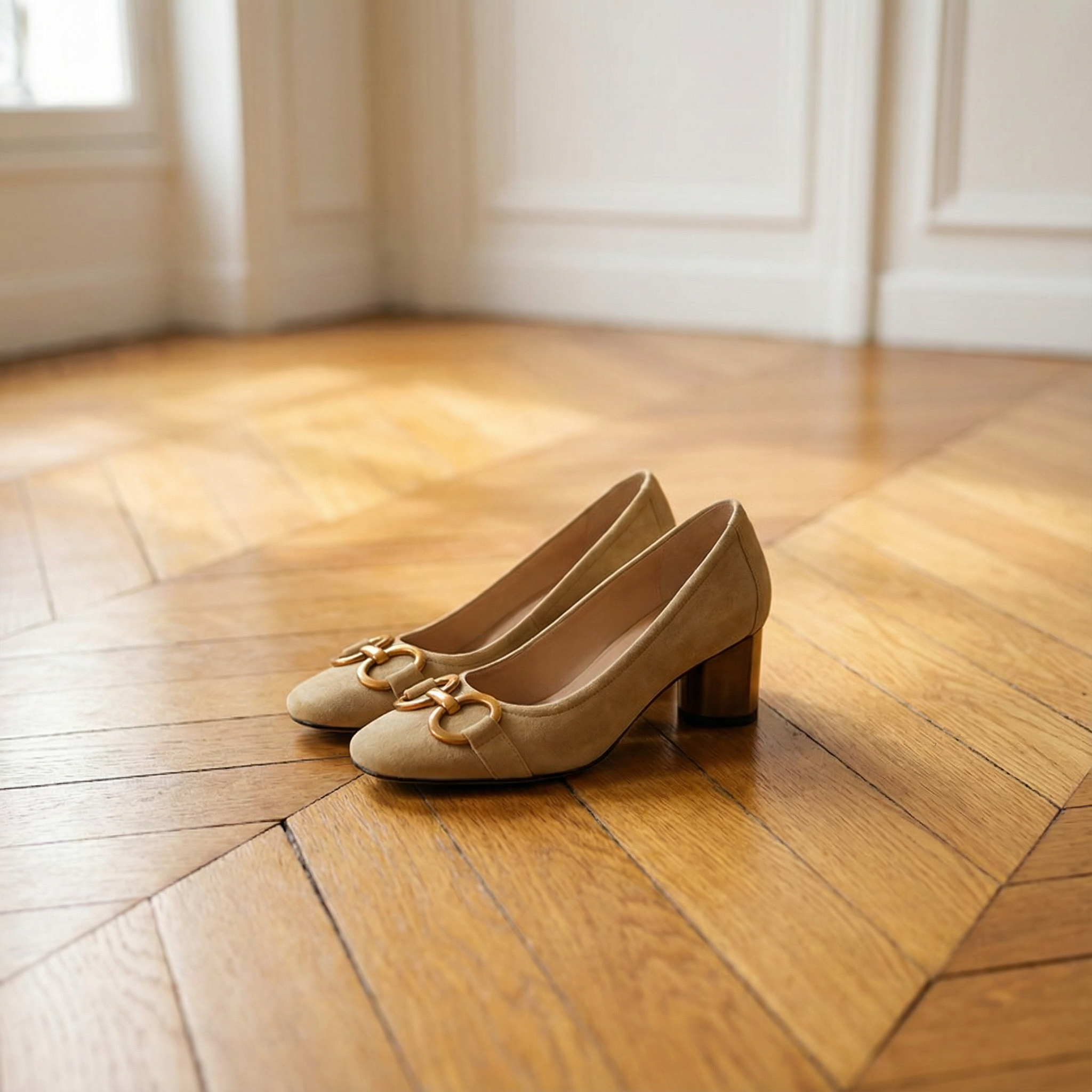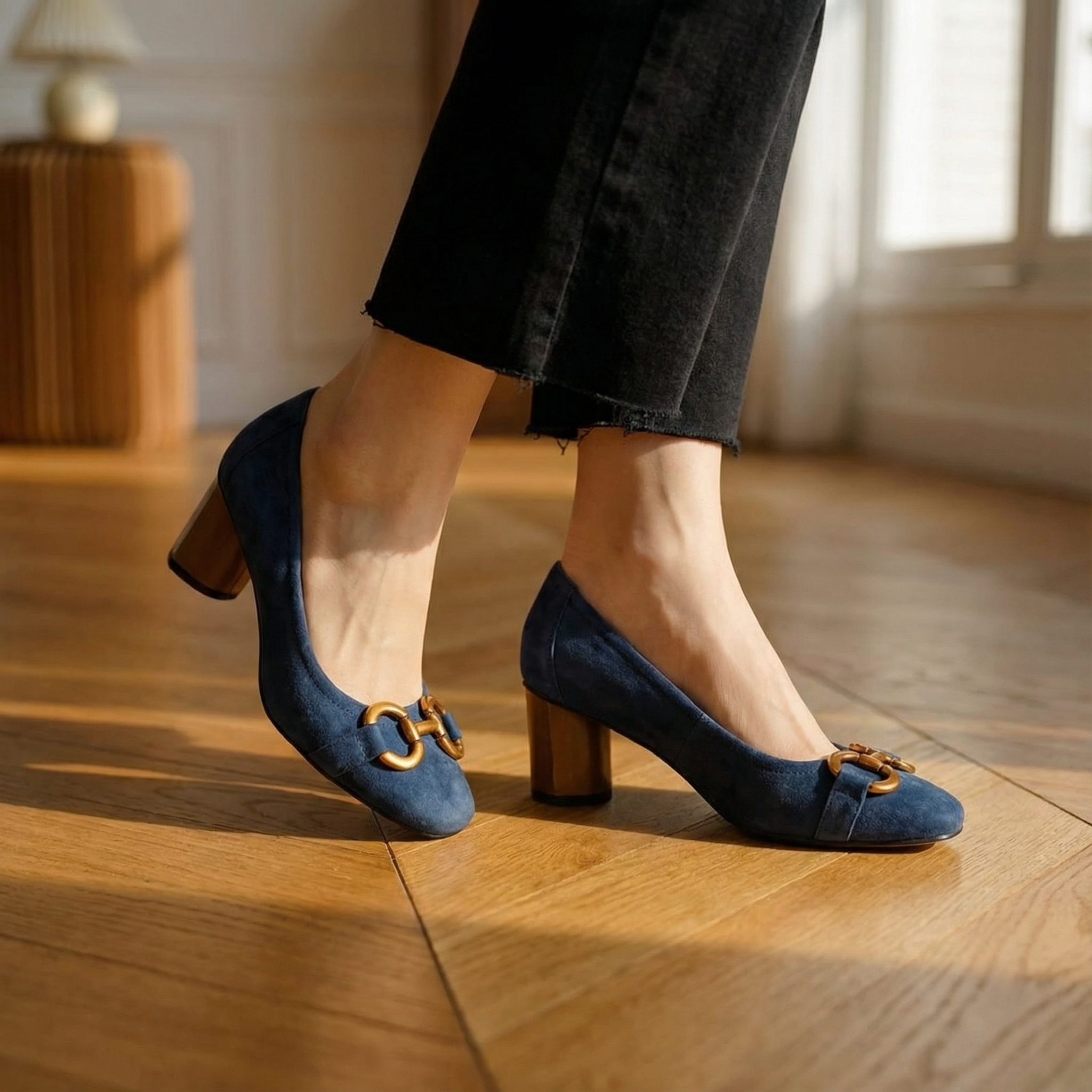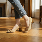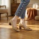 Women's block heel loafers with suede upper and metal buckle accent. Features round toe, embroidered detail, cushioned insole, and rubber sole. Suitable for casual wear, everyday outfits, or dressy occasions.