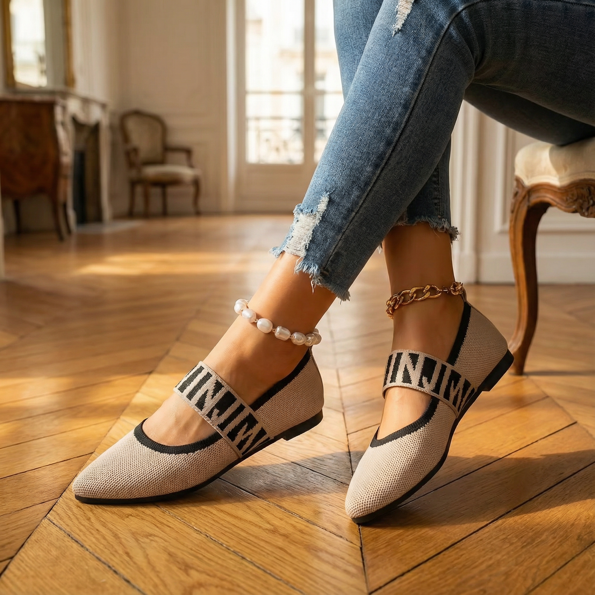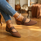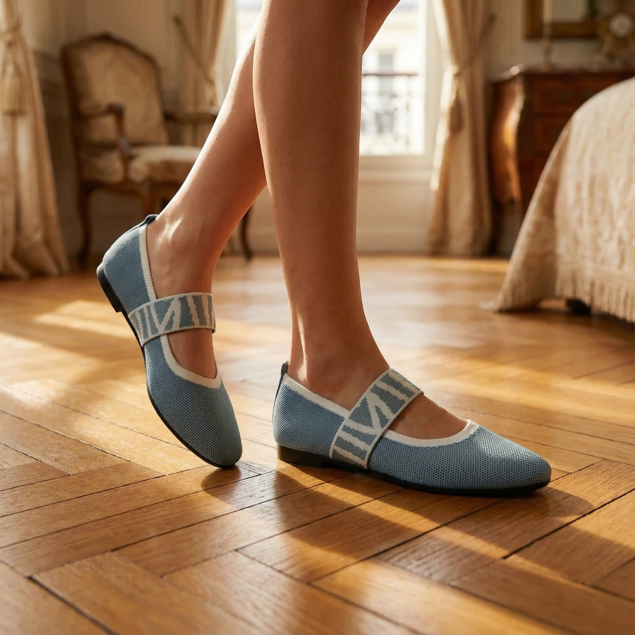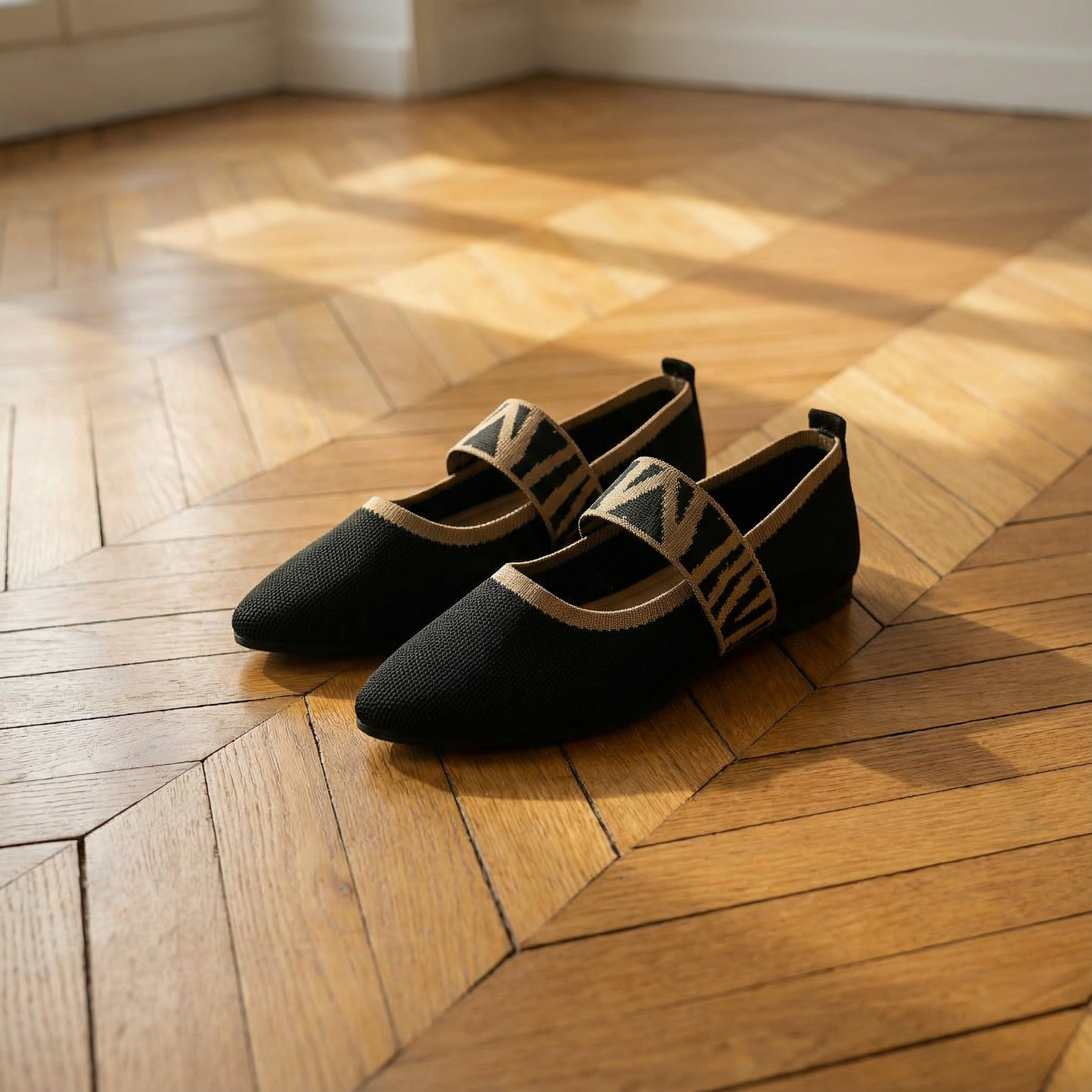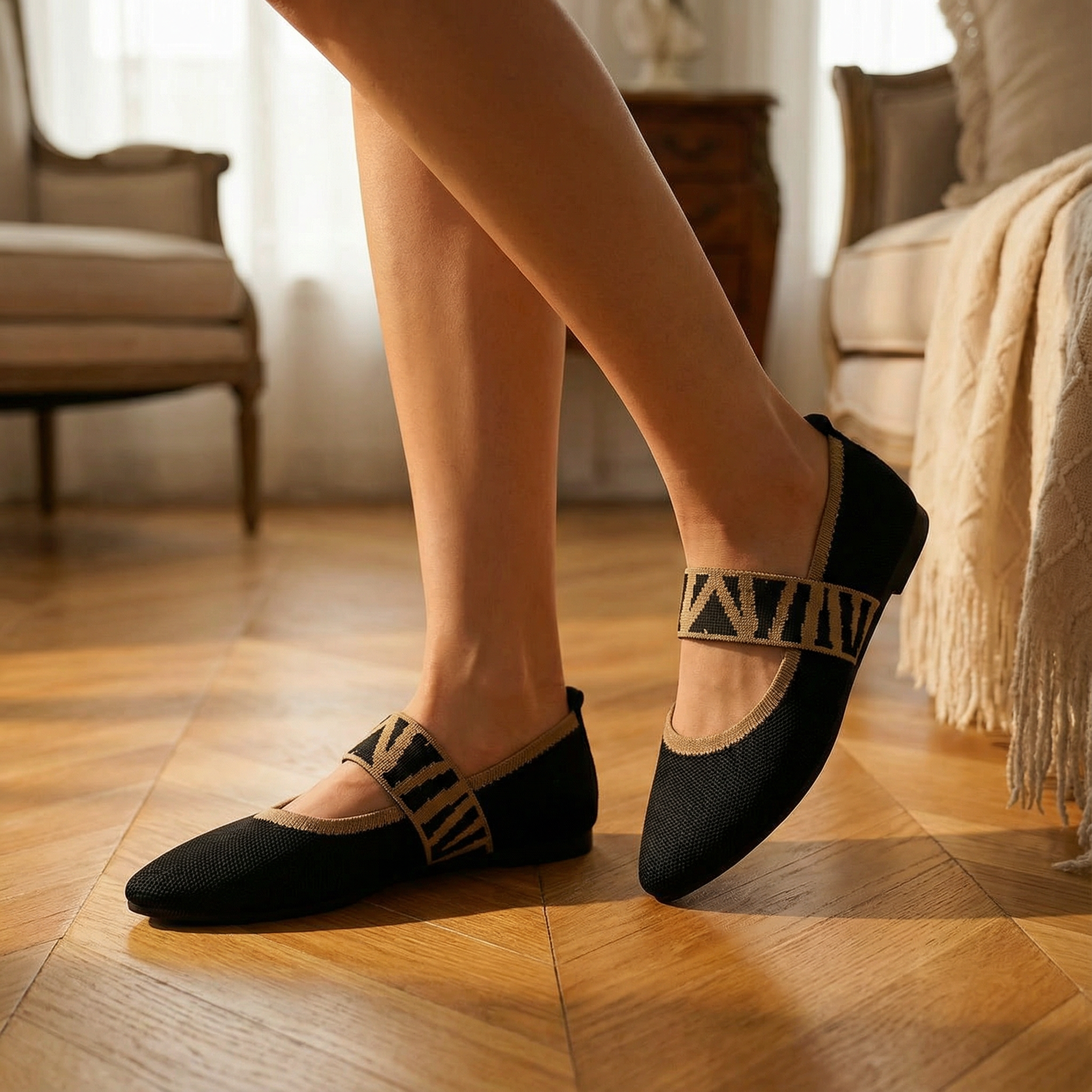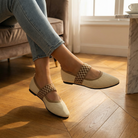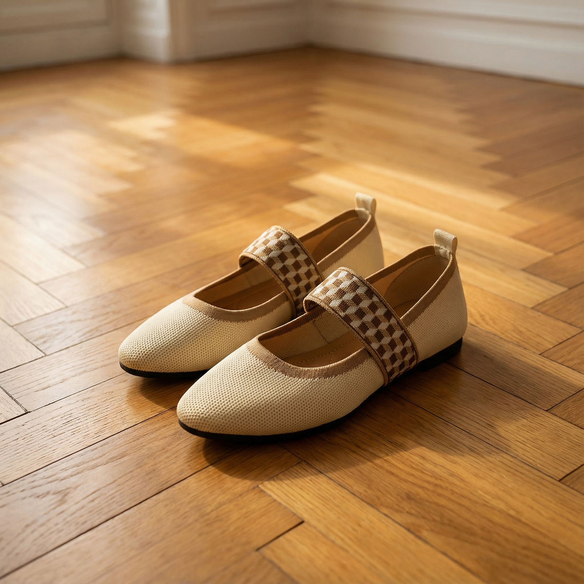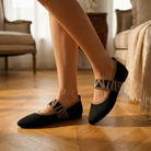 Women's pointed toe ballet flats with breathable knit upper and contrast gingham elastic strap. Mary Jane-style design with slip-on fit and cushioned insole for all-day comfort. Lightweight construction with non-slip rubber sole. A versatile everyday flat for office wear, casual outings, brunch, or travel.