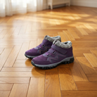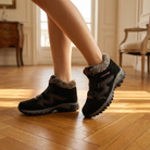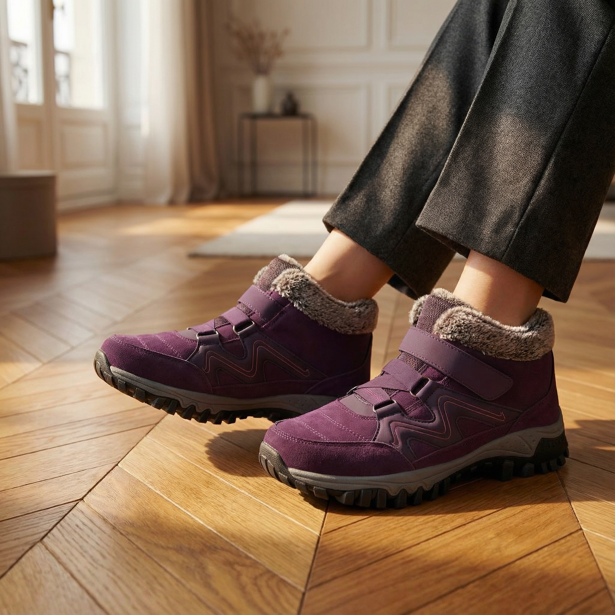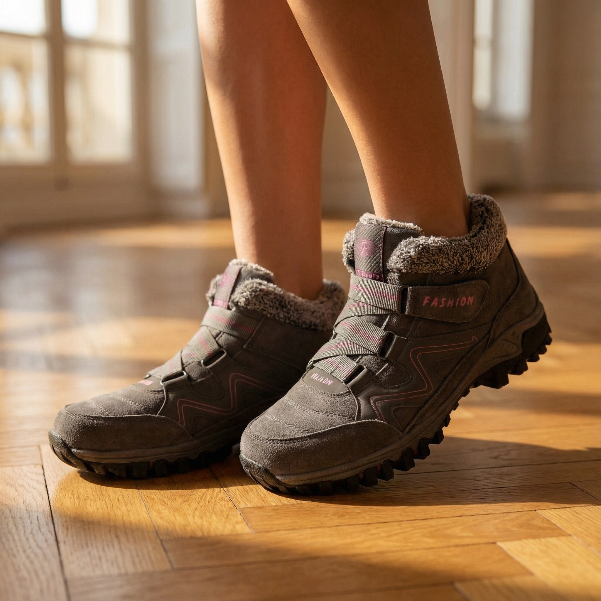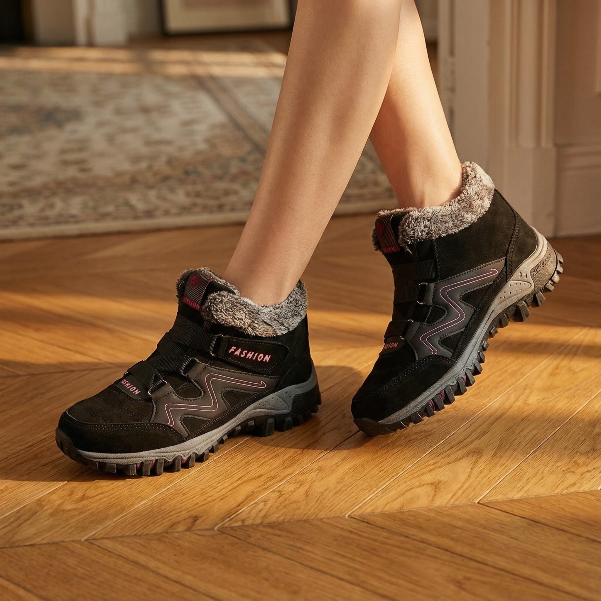 Women's fur-lined ankle boots with faux fur collar and warm fleece lining. Features hook-and-loop strap closure for easy on-off, cushioned insole, and rugged non-slip rubber outsole with deep tread for grip. Mixed-texture upper with suede-effect panels and reinforced toe. Lightweight supportive construction. A warm practical boot for winter walks, cold weather, outdoor activities, or everyday cold-season wear.