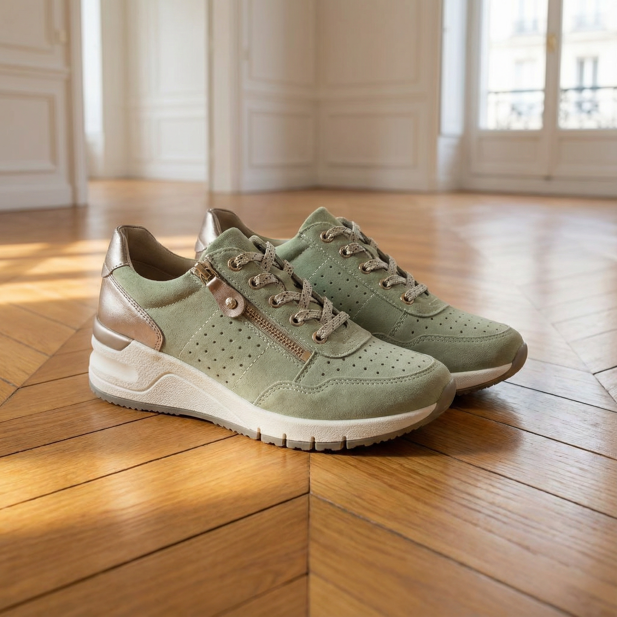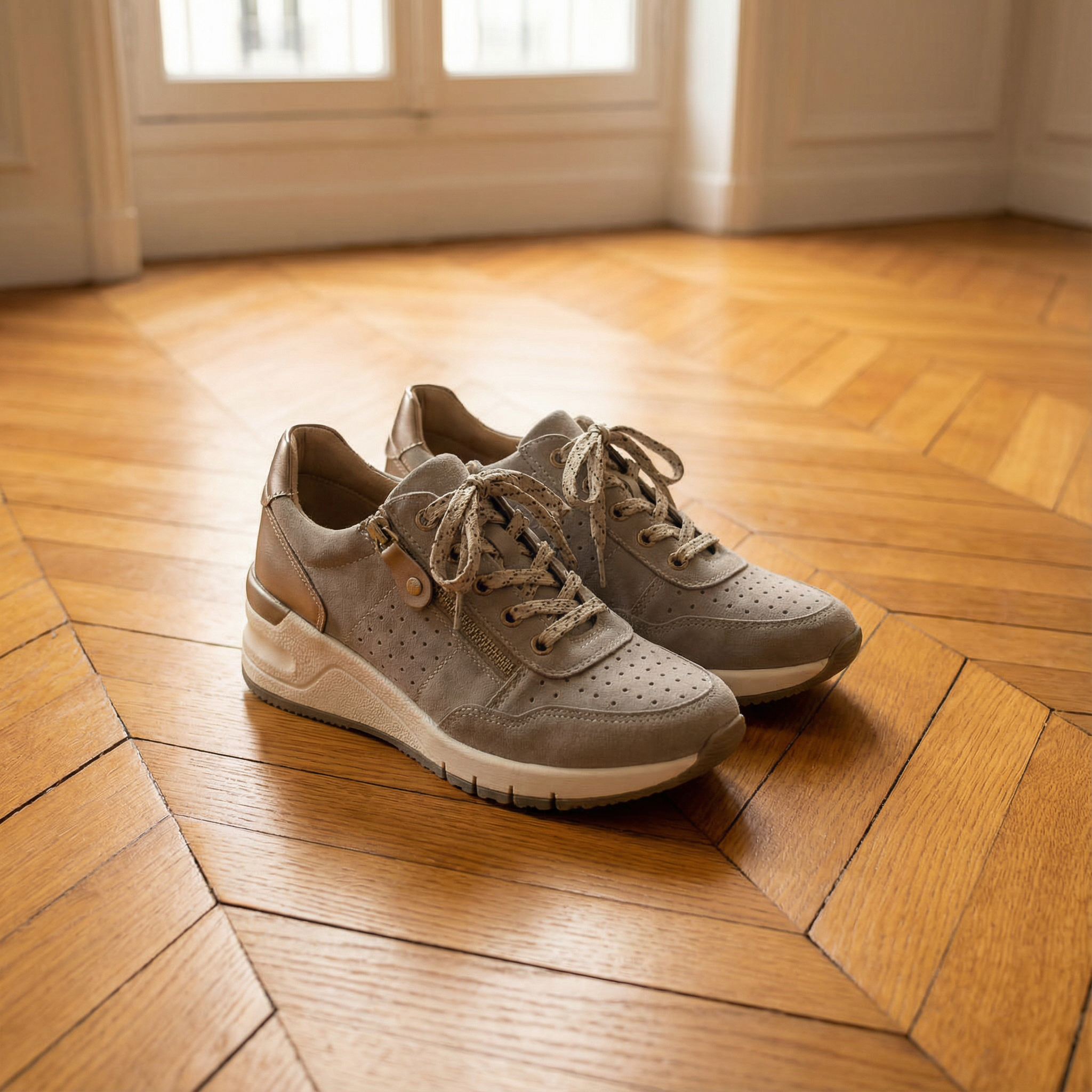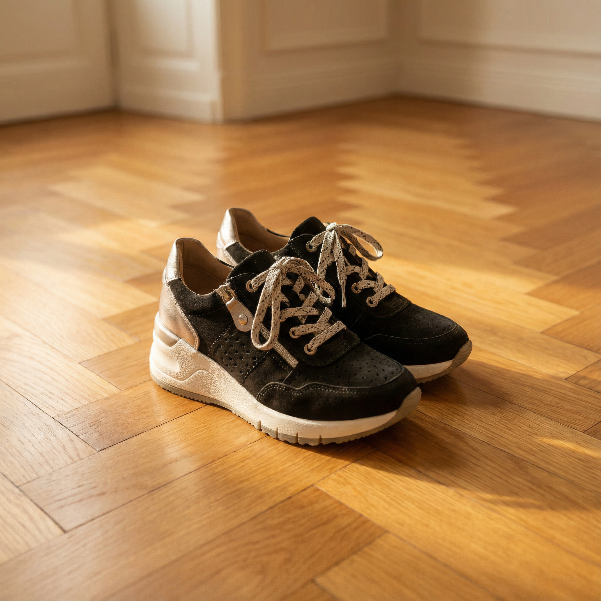 Women's lace-up wedge trainers with upper and perforated side panels. Features metallic mirror-finish heel counter and tongue accent, decorative side button, speckled laces, and padded collar. Chunky platform wedge sole with textured rubber outsole. Suitable for casual wear, everyday outfits, walking, or weekend activities.