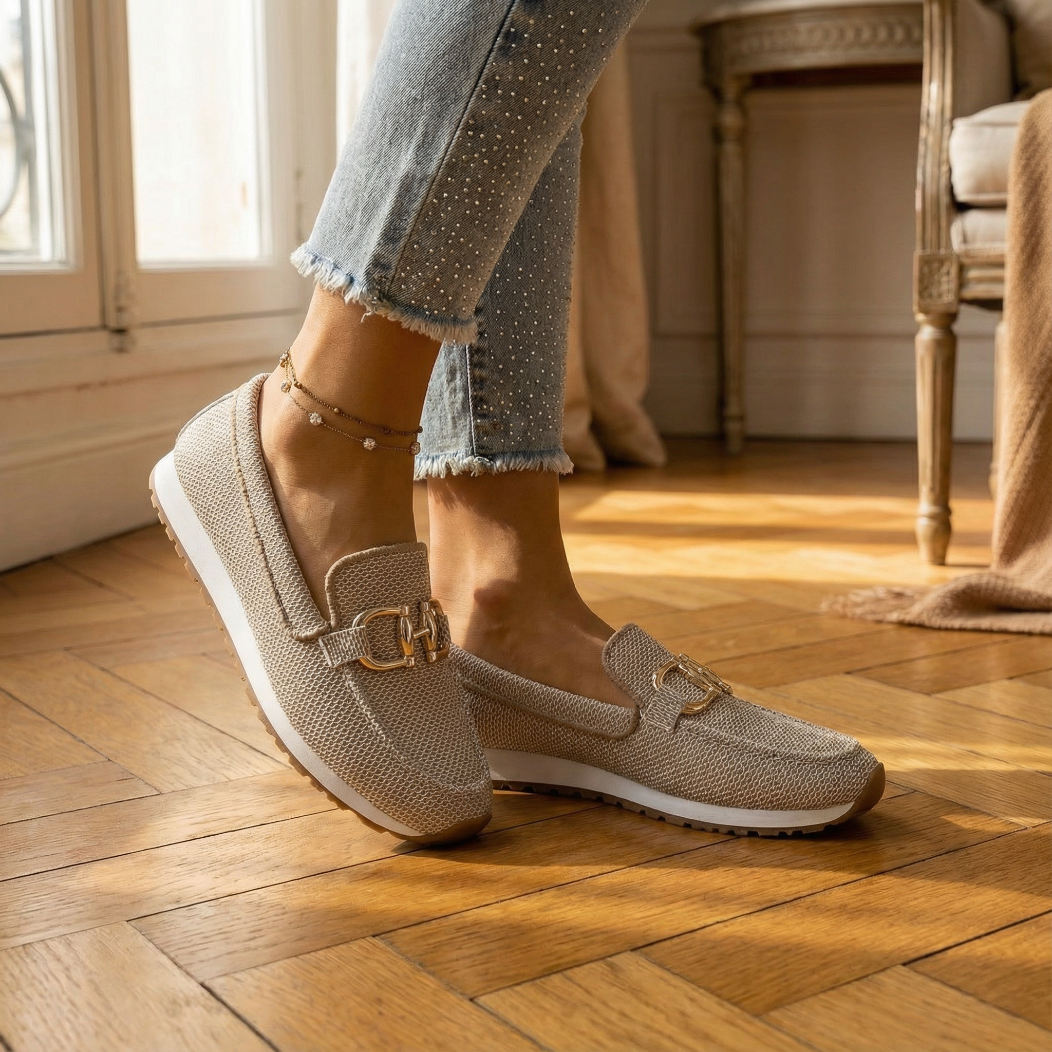 Women's slip-on platform loafers with breathable knit mesh upper and gold chain-link buckle detail. Features round toe, cushioned insole, and chunky platform sole with gum-style tread for grip. Lightweight flexible construction with easy slip-on fit. A casual-smart hybrid for everyday wear, weekend outings, travel, or relaxed office looks.