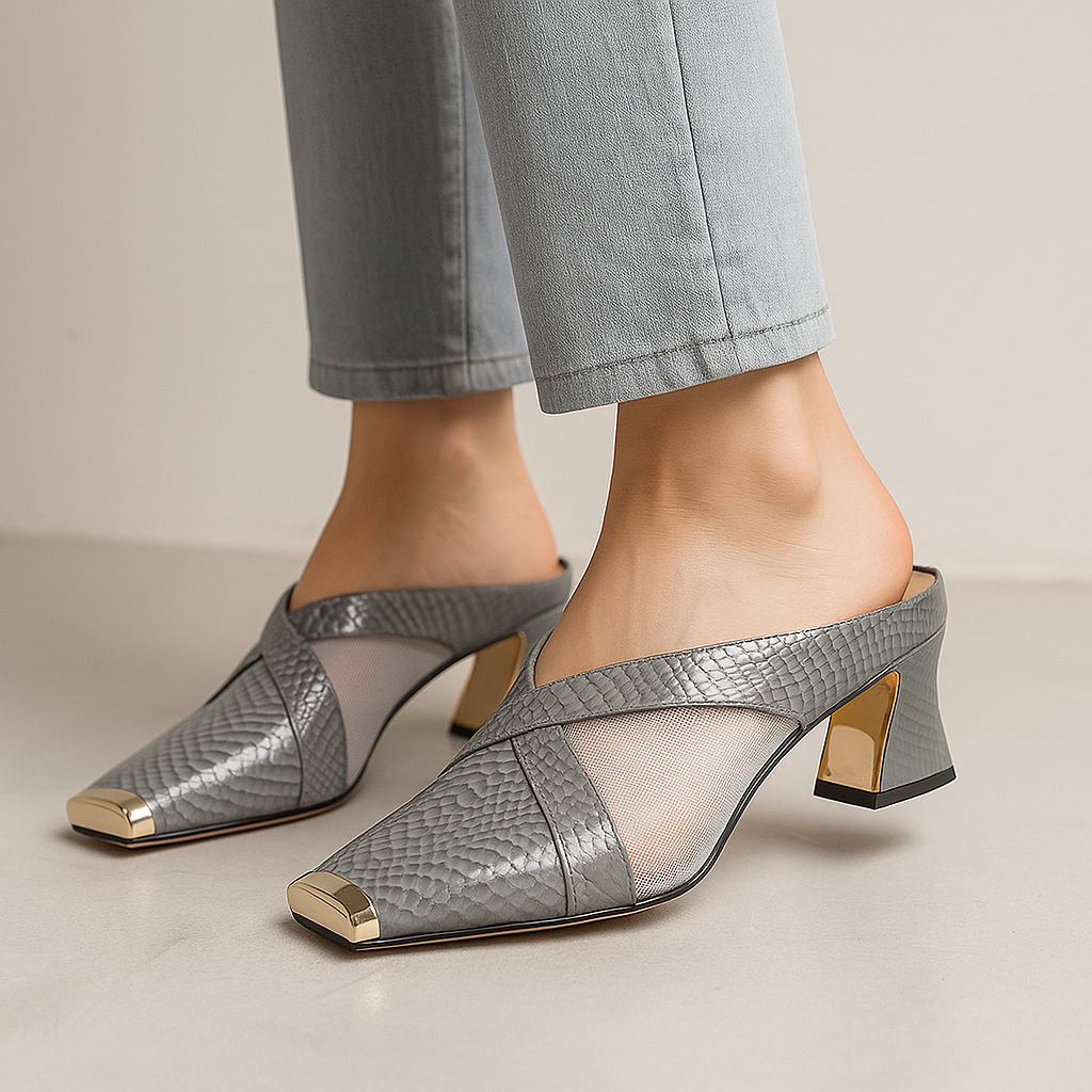 A bold sculptural heel, square toe, and glossy finish bring chic, modern style to these statement-making heeled mules. With soft cushioning and gold-accented details, they offer breathable comfort in a standout design.