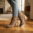 Women's western-style ankle boots with soft upper and embroidered stitching detail. Features studded trim along sole edge, round toe, chunky block heel, and rubber sole. Suitable for casual wear, everyday outfits, or dressy occasions.