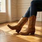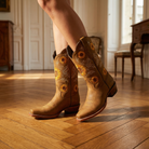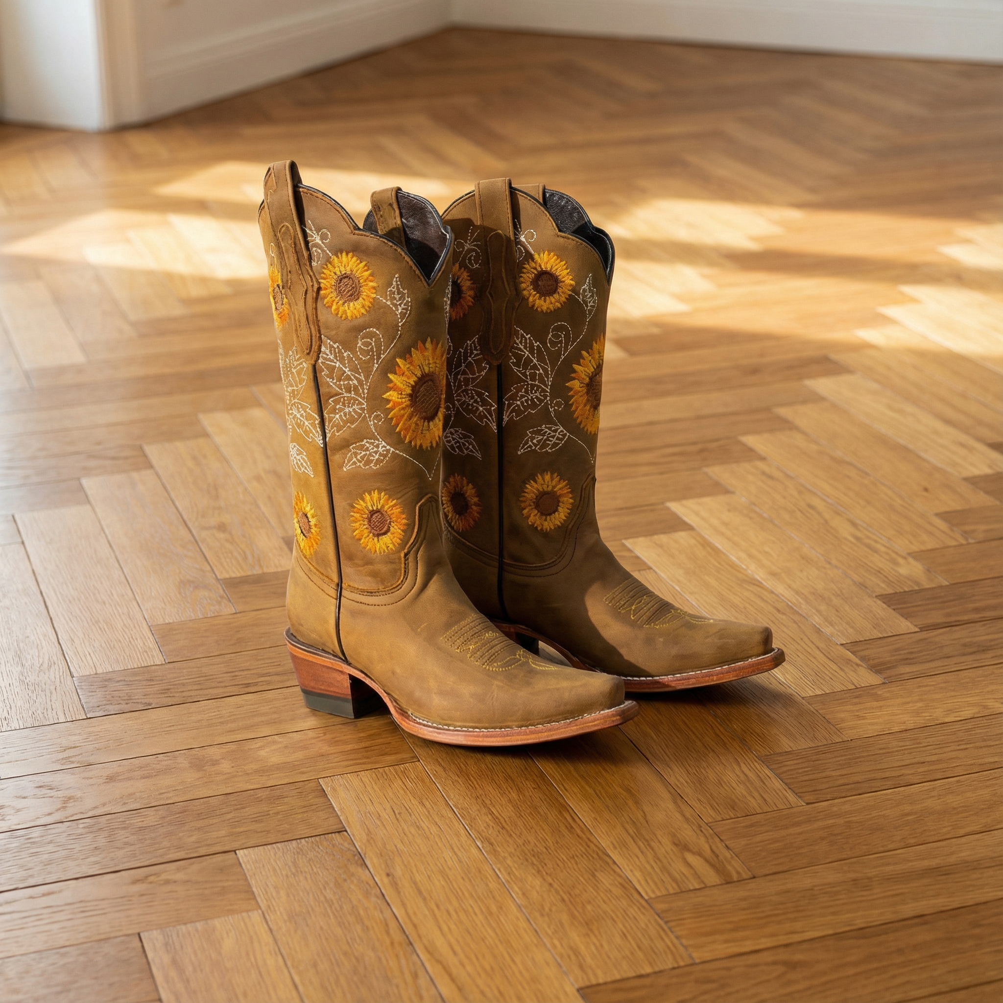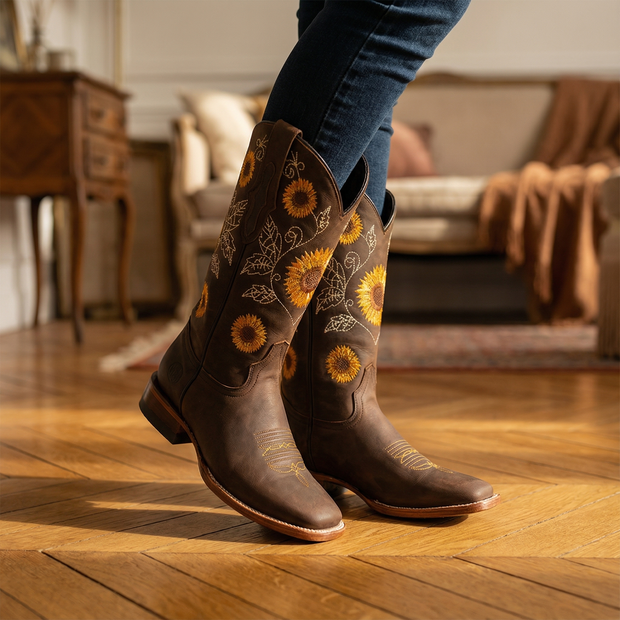 Women's western-style boots with upper and sunflower embroidery detail. Features round toe, block heel, and rubber sole. Suitable for casual wear, everyday outfits, or festival wear.