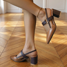 Women's pointed toe slingback heels with two-tone design and gold buckle hardware. Features structured block heel, adjustable double strap with D-ring closure, and contrast trim detailing. Soft upper with cushioned insole. Heel height 2 inches. A refined everyday style for office wear, smart-casual occasions, or polished daytime looks.