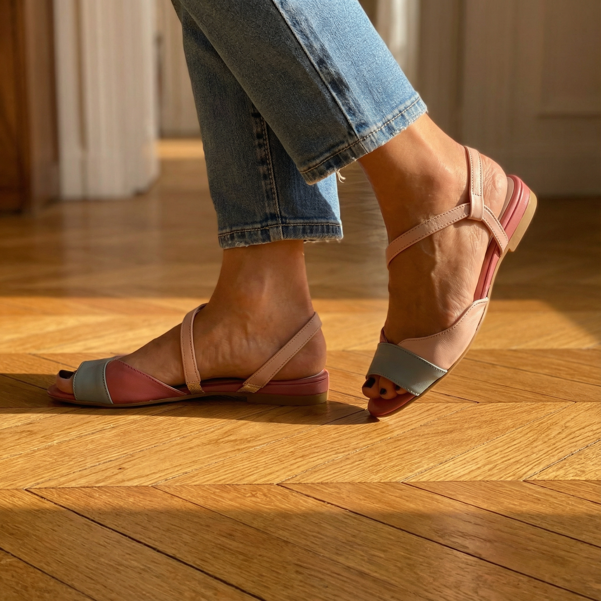 Women's open toe flat sandals with colourblock design and adjustable ankle strap. Features wide toe band with layered panel detail, buckle closure, and low flat heel.Β Cushioned insole with flexible sole. A playful versatile sandal for summer days, casual outings, holidays, or everyday wear.
