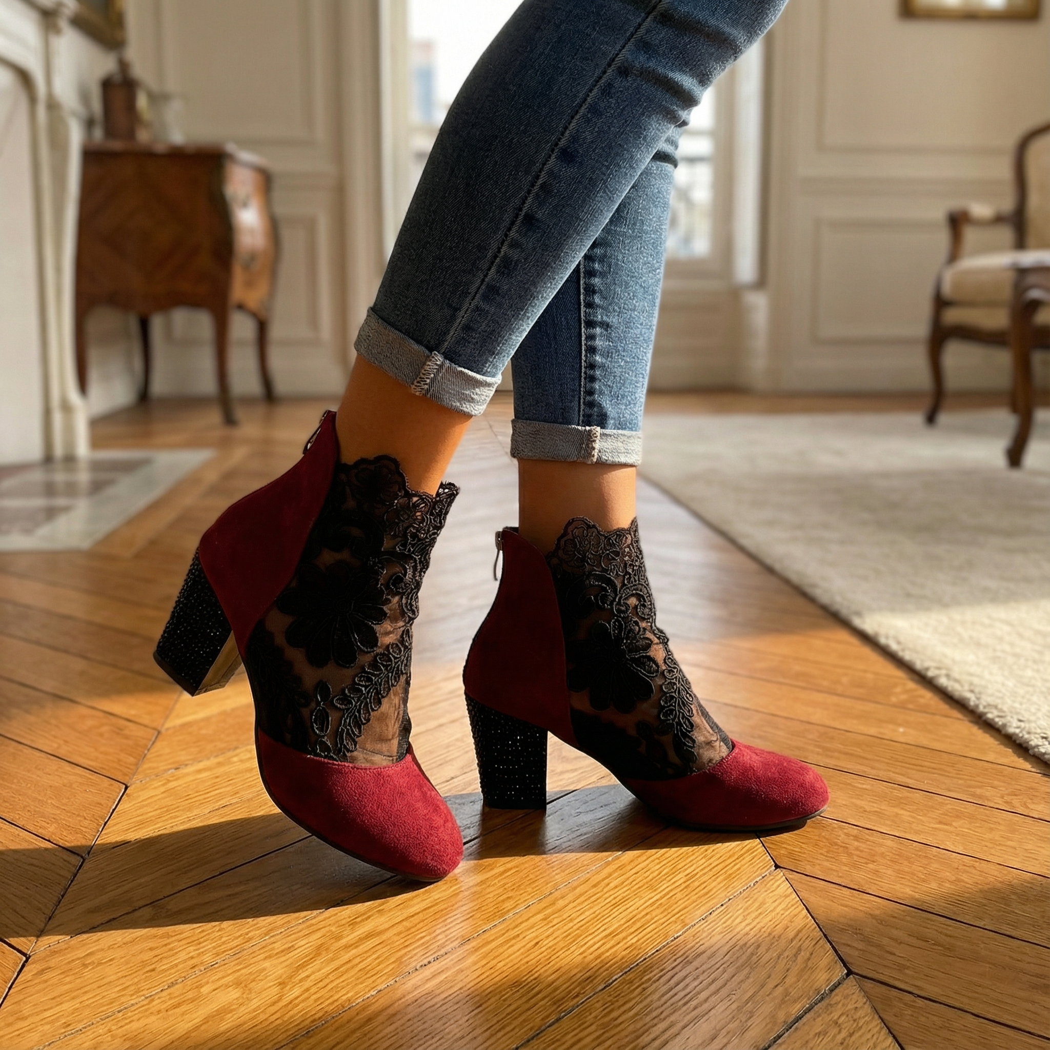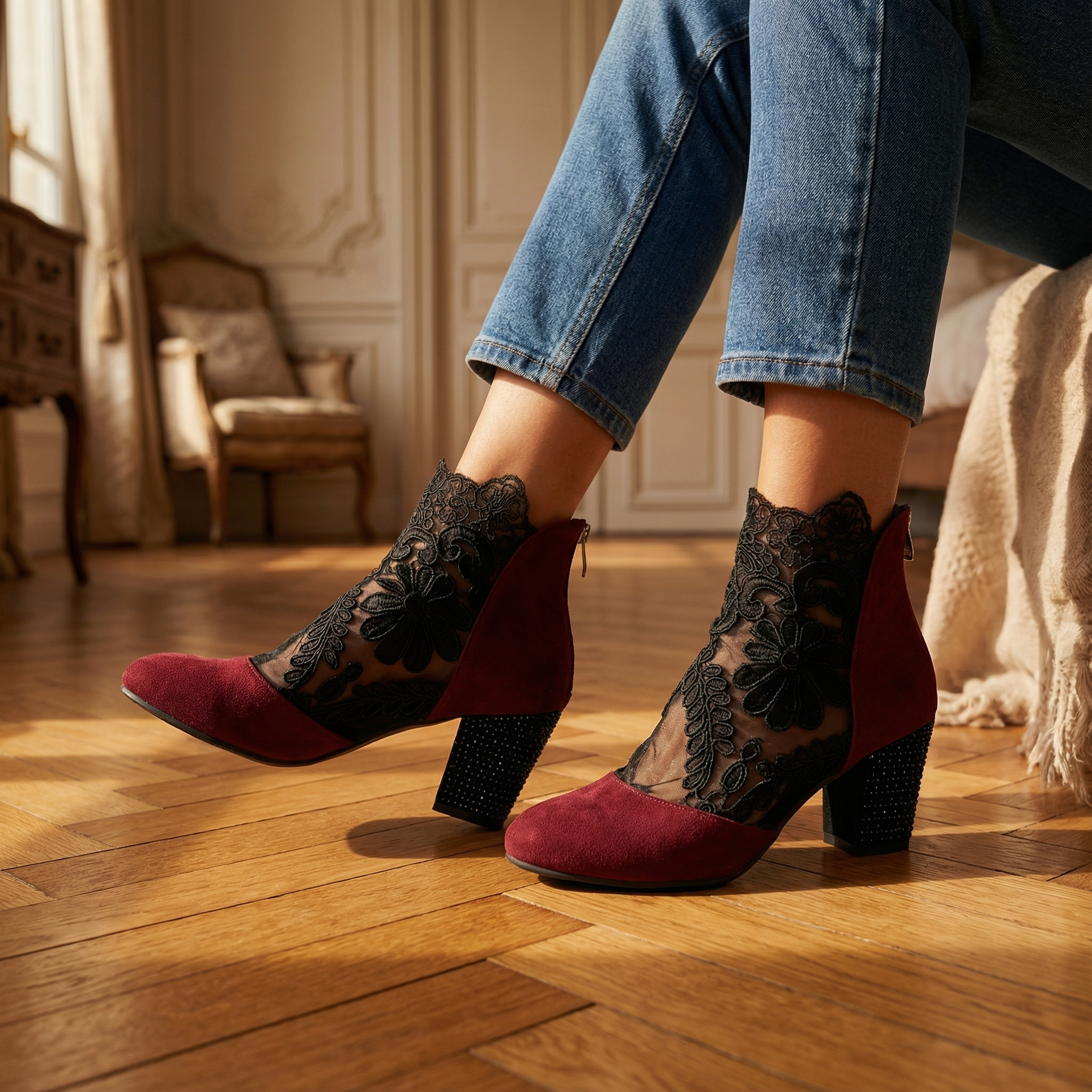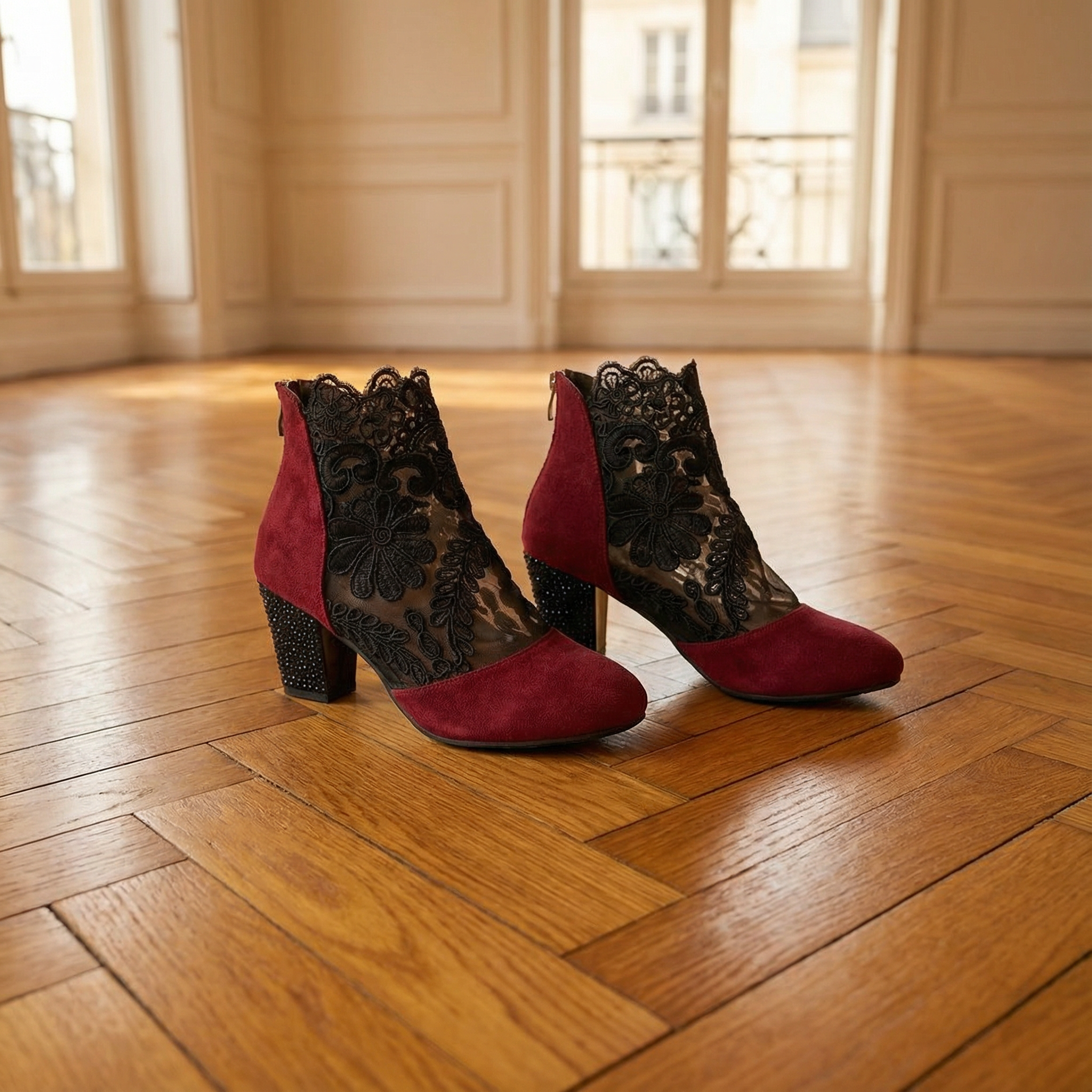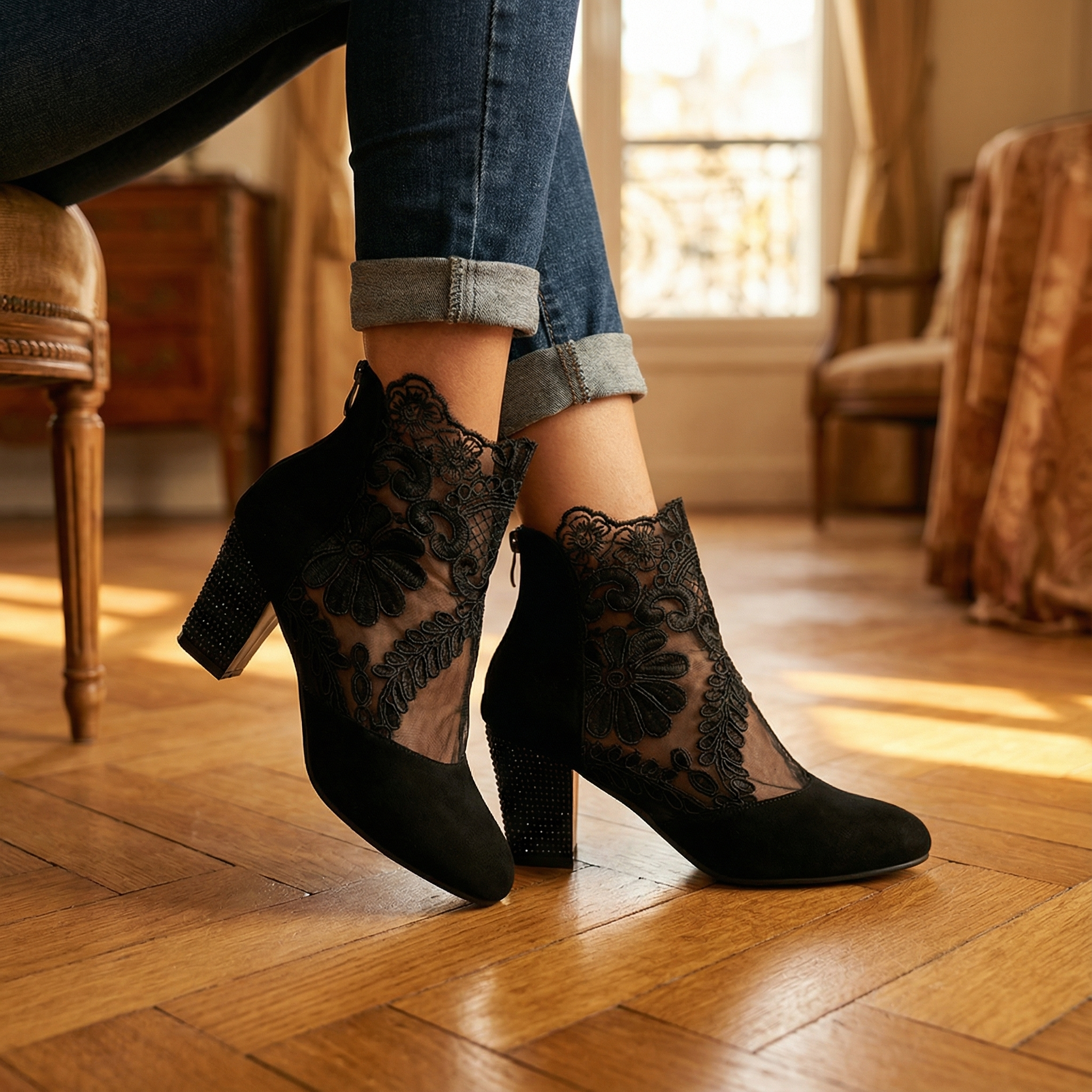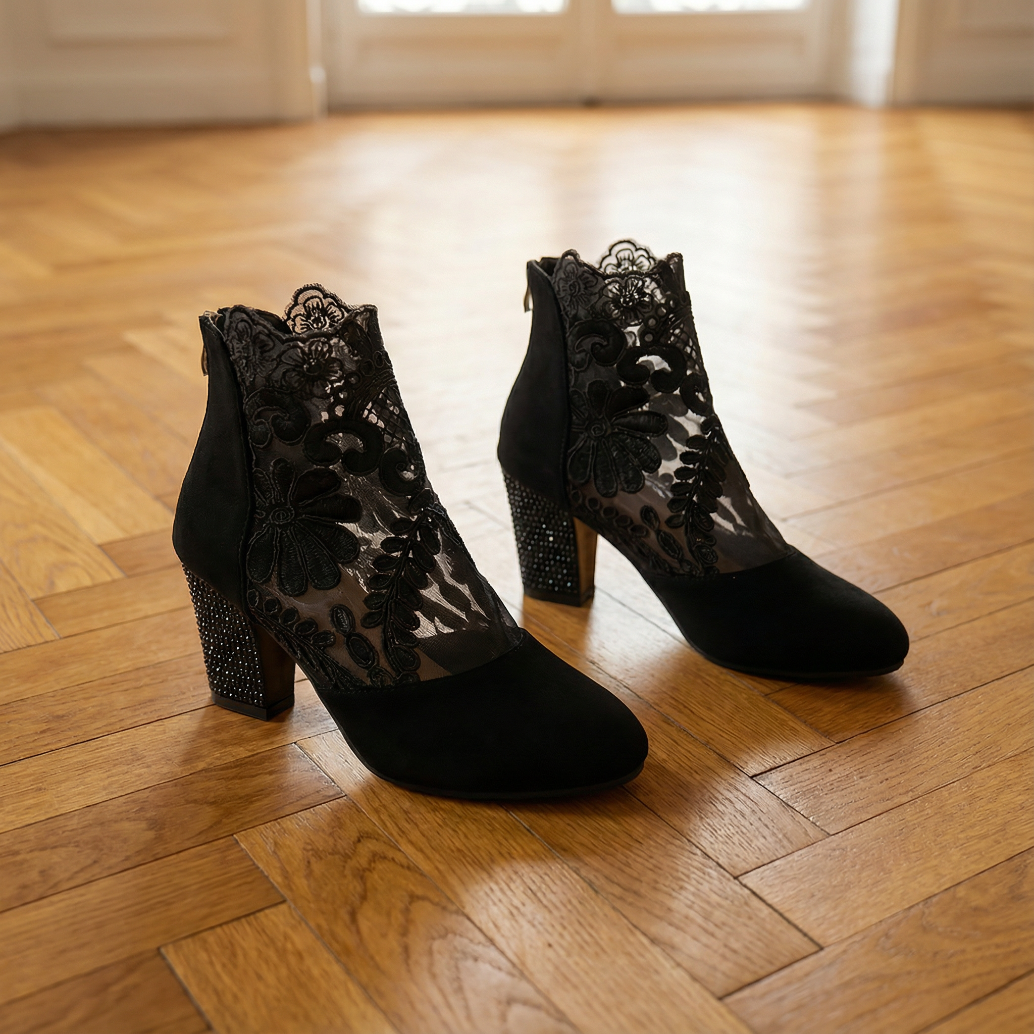 Elegant Lace Heels – Women's Floral Lace Shoes With Sparkling Rhinestones