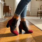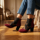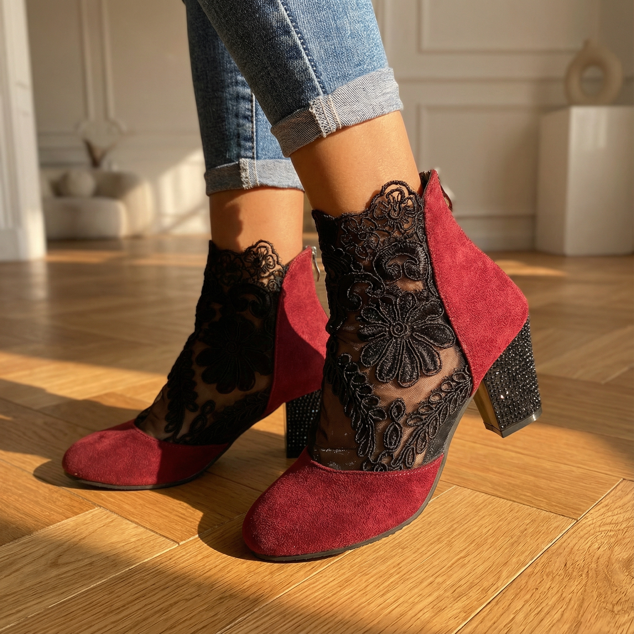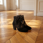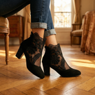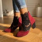 Women's ankle boots with floral lace mesh panels and faux suede trim. Features pointed toe, back zip closure, and chunky block heel with rhinestone embellishment. Breathable mesh upper with embroidered lace overlay. Cushioned insole for comfort. Heel height approximately 2.5 inches. A feminine statement boot for summer evenings, parties, date nights, or special occasions.
