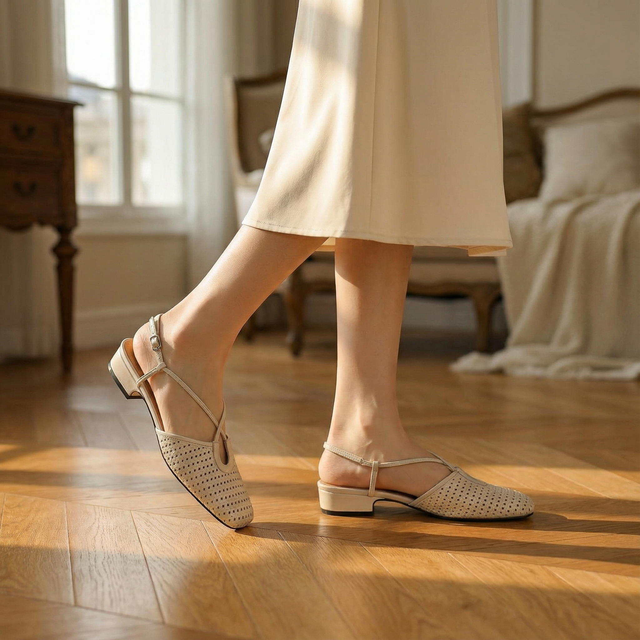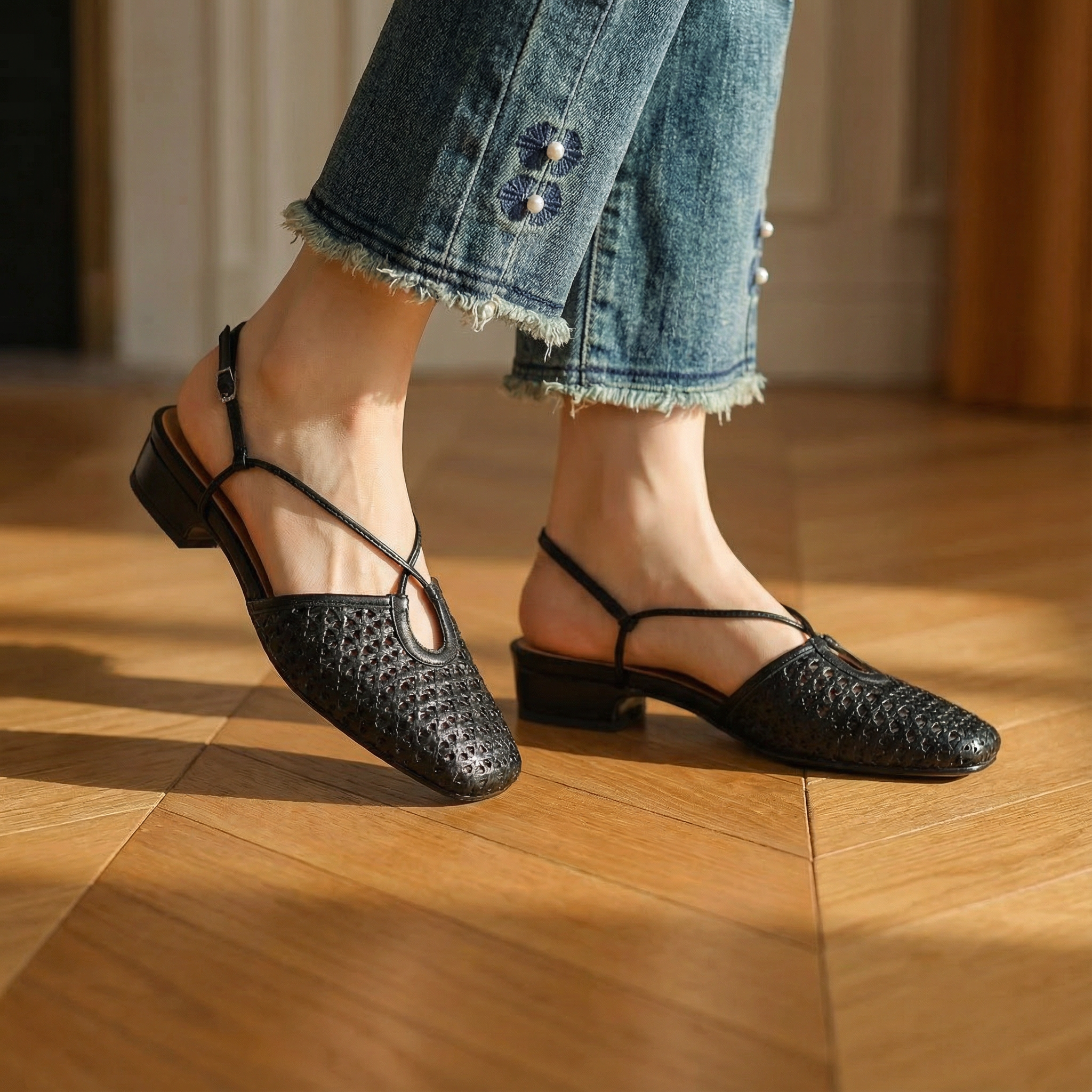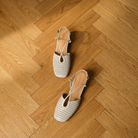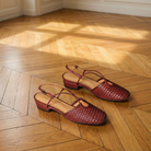 Women's closed toe slingback flats with woven perforated upper and delicate cross-strap detail. Features square toe, adjustable slingback with buckle closure, and low block heel. Breathable cut-out design with cushioned insole for comfort. Heel height approximately 1 inch. A refined everyday style for office wear, smart-casual occasions, or elegant summer outings.