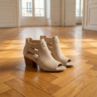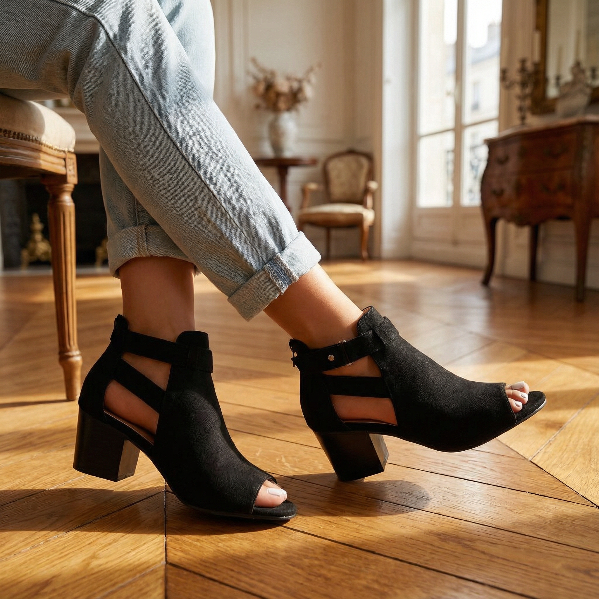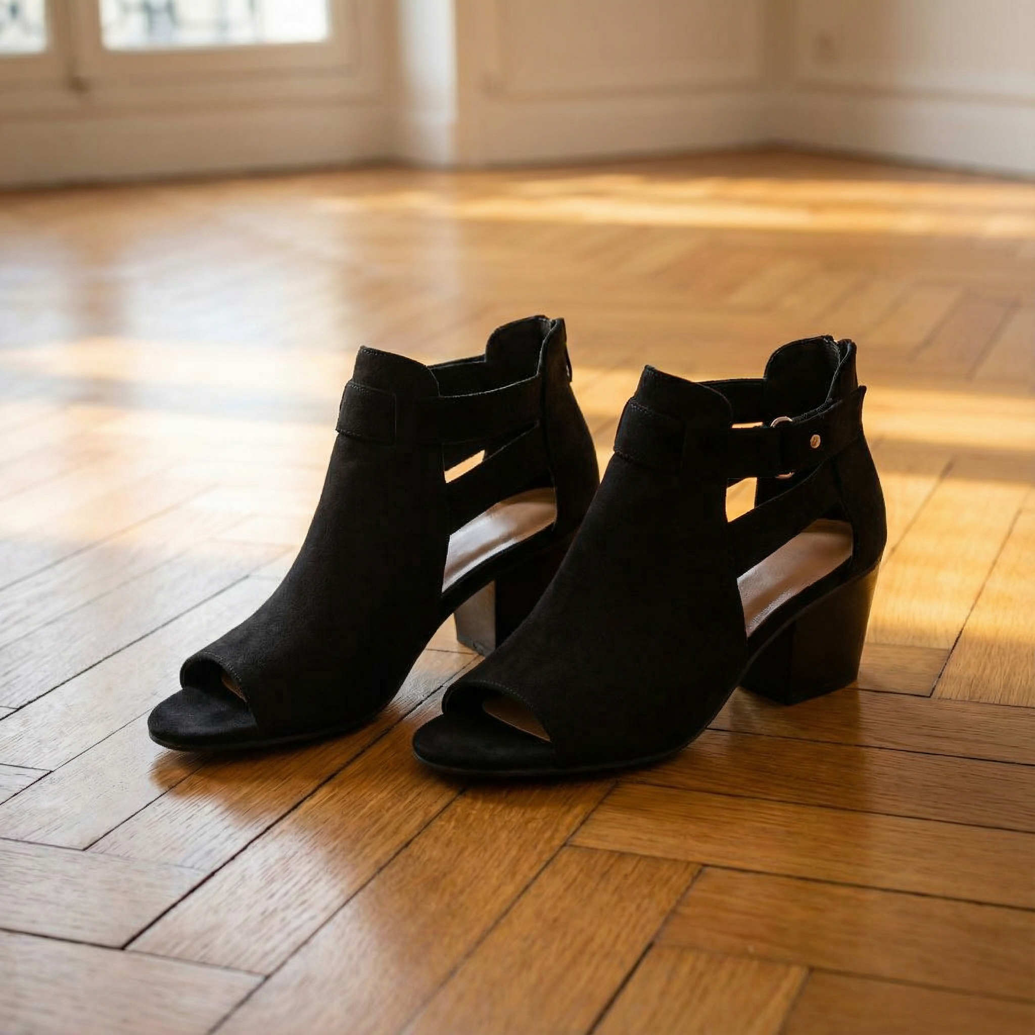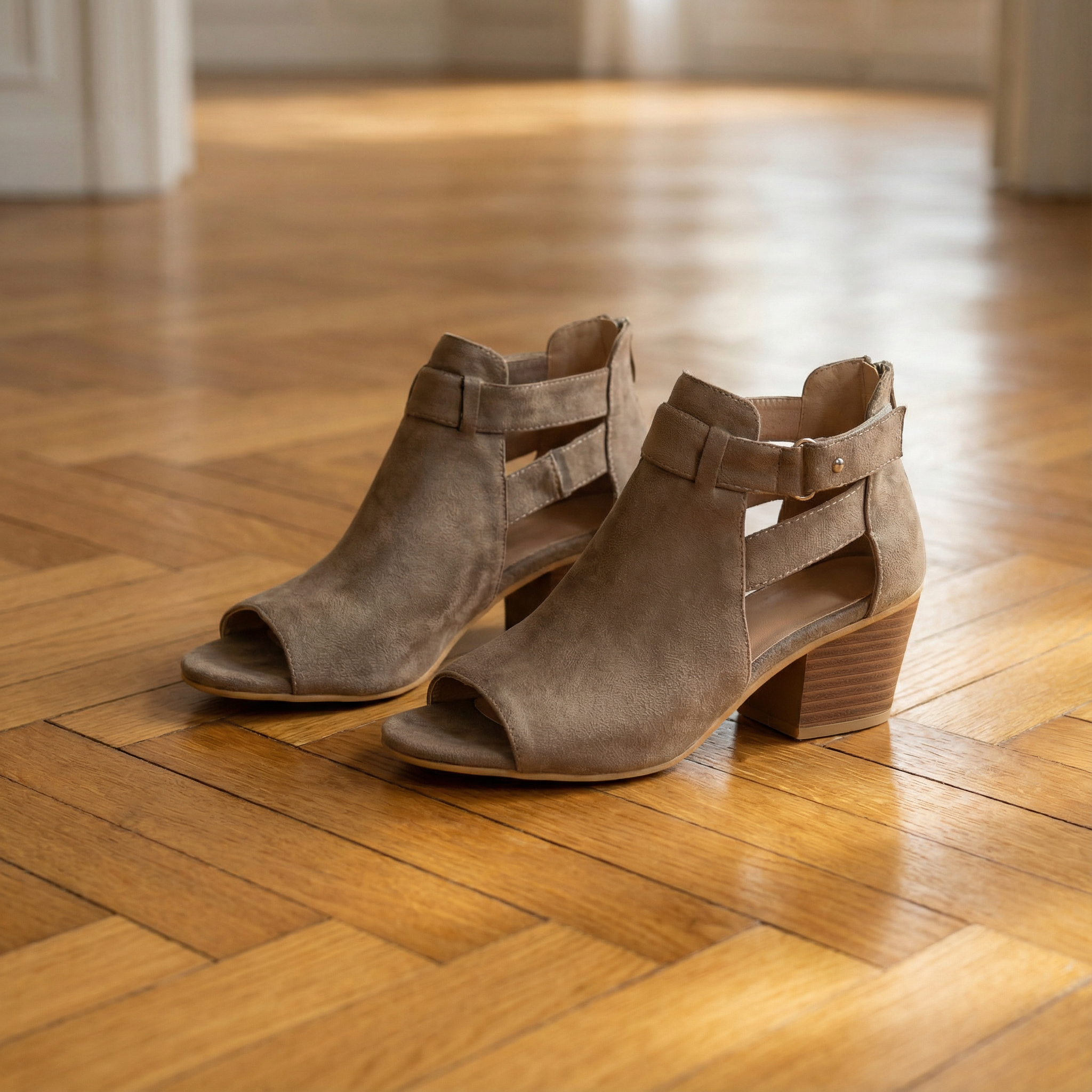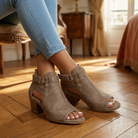 Women's peep toe block heel sandals with suede upper and geometric cutout side panels. Features open toe design, rear zipper closure, buckle strap accent, block heel, and rubber sole. Suitable for casual wear, everyday outfits, or dressy occasions.