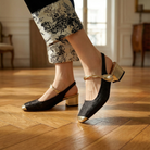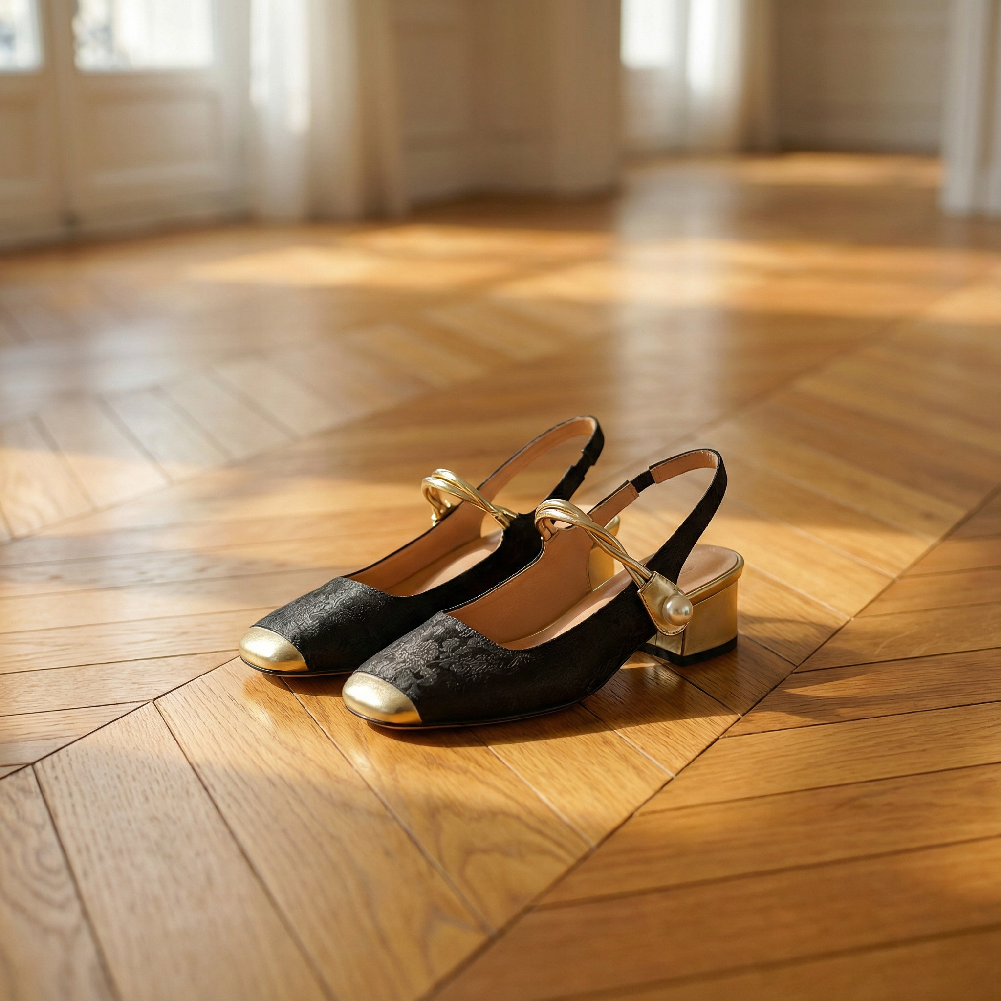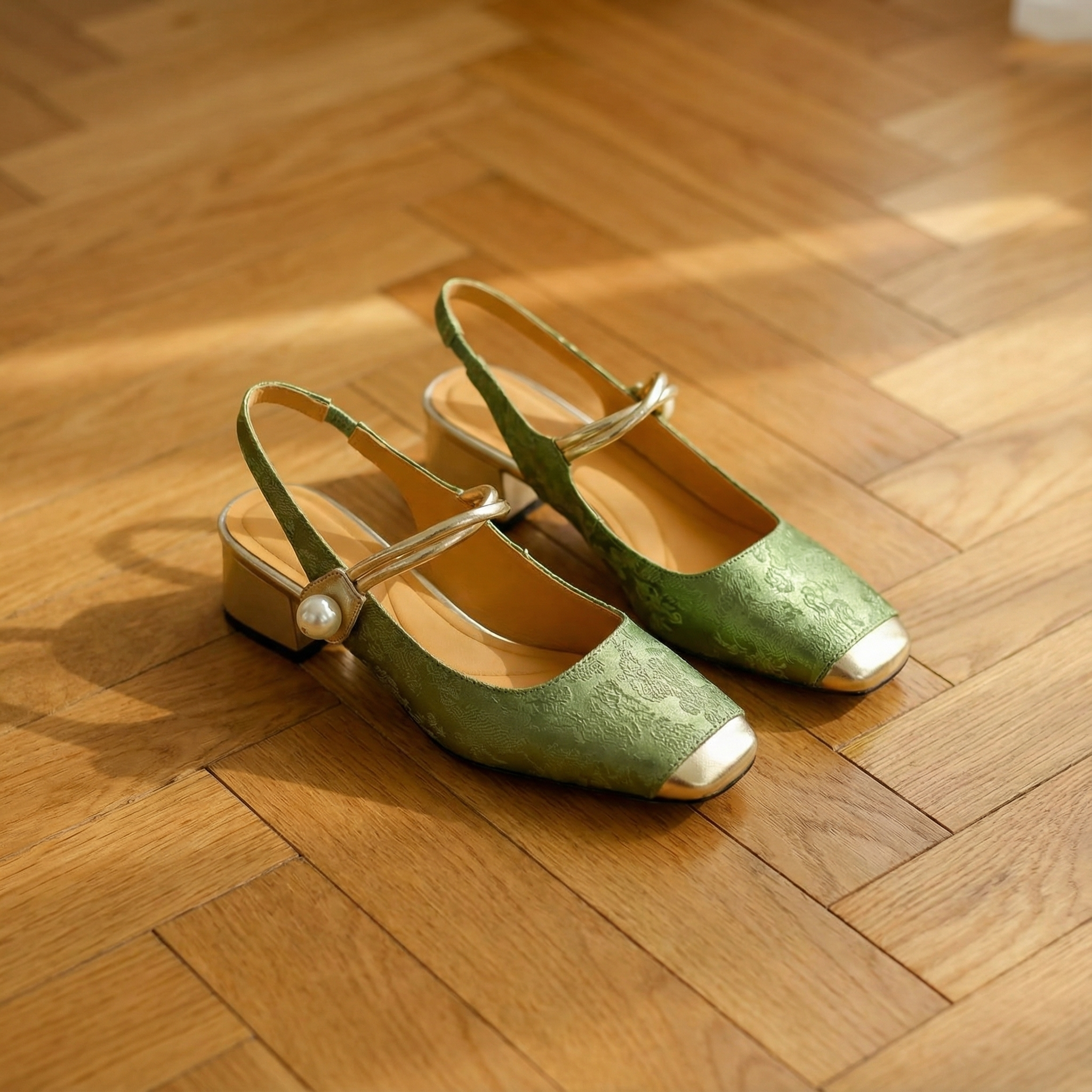 Women's square toe slingback heels with jacquard satin upper and gold metallic trim. Features pearl button detail on elasticated strap, gold cap toe, and wrapped block heel. Vintage-inspired design with padded insole for comfort. Heel height approximately 1.5 inches. An elegant statement style for weddings, garden parties, special occasions, or refined daytime events.