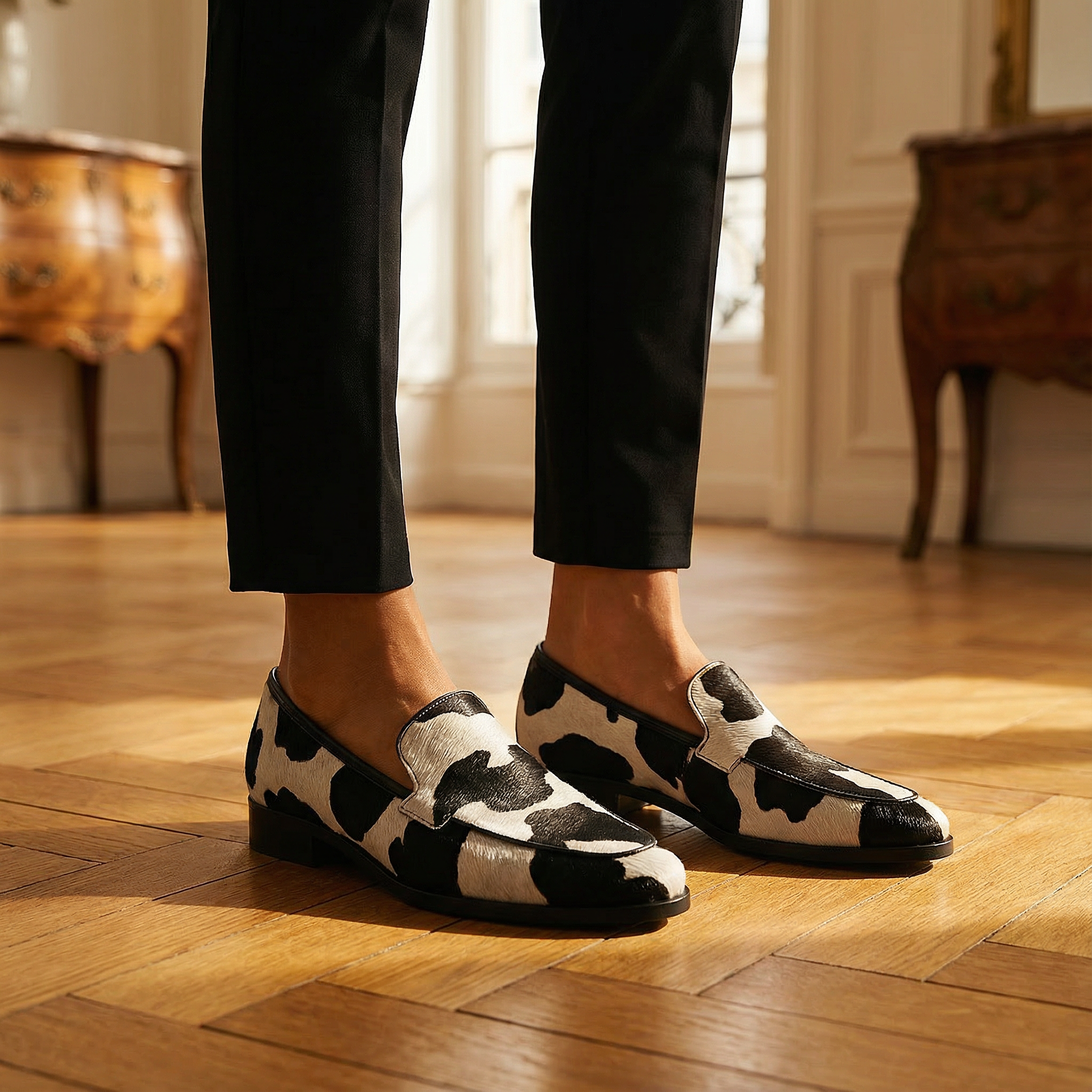 Women's loafers with cow print calf hair upper and solid trim. Features pointed toe, slip-on construction, raised heel, and rubber sole. Suitable for casual wear, everyday outfits, or all-season wear.