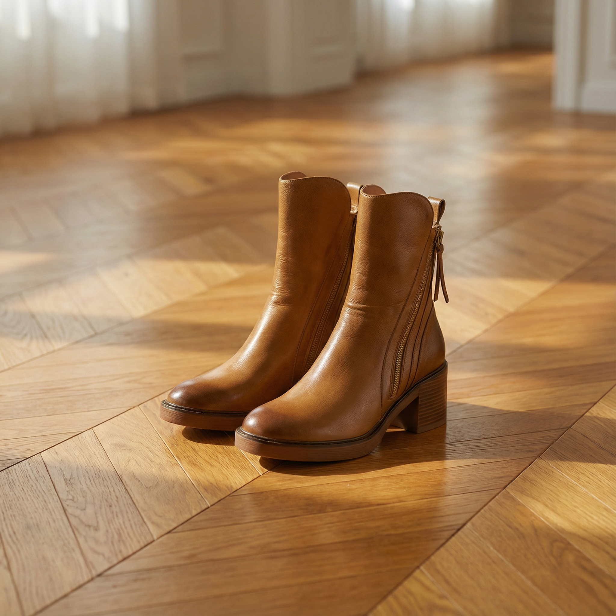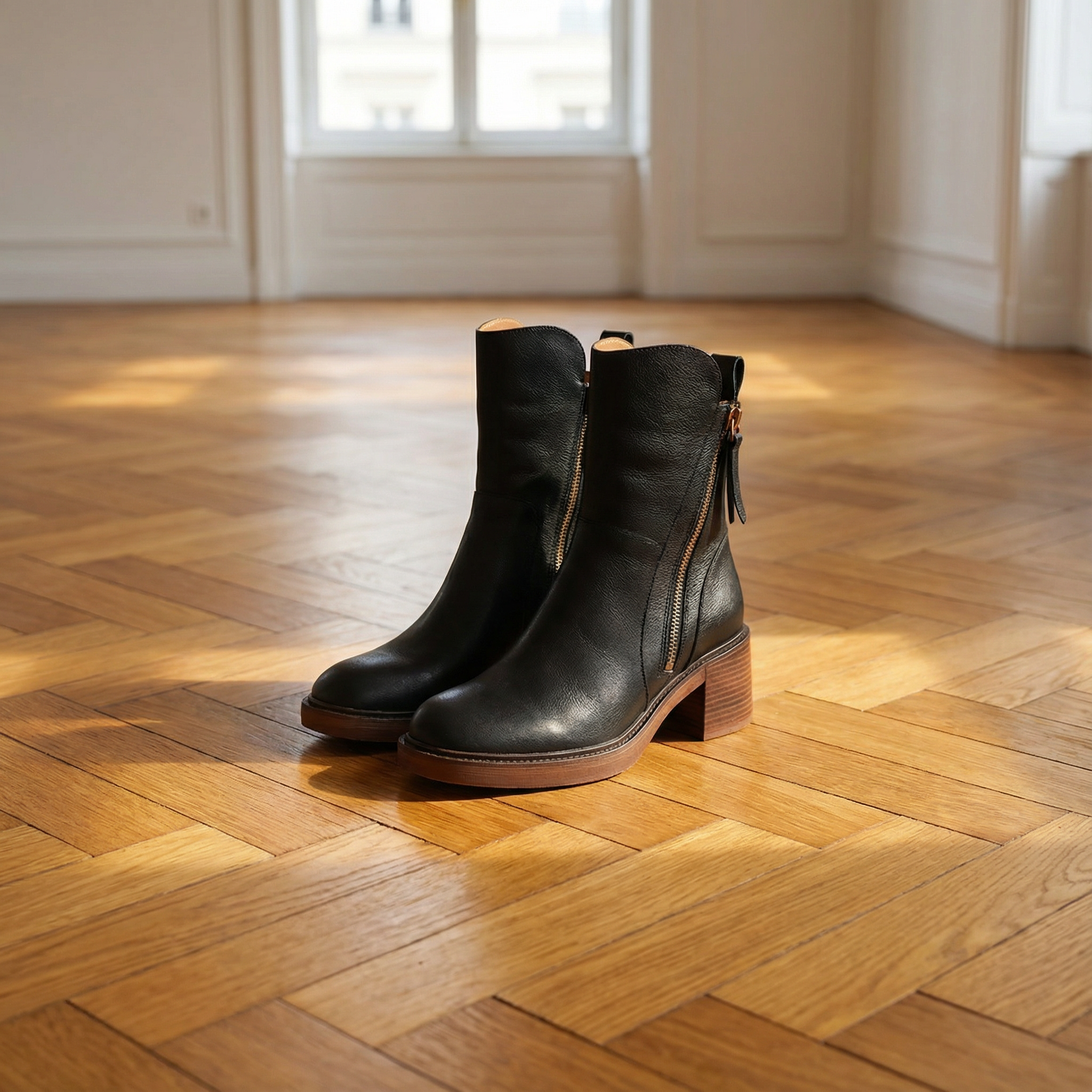 Women's ankle boots with smooth upper and side zipper closure. Features round toe, stacked block heel 2 inches, cushioned insole, and rubber sole. Suitable for casual wear, everyday outfits, or dressy occasions.