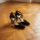 Serena Crosswalk Heels - Black Suede Mid Heel Pumps With Sculpted Ankle Straps