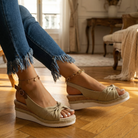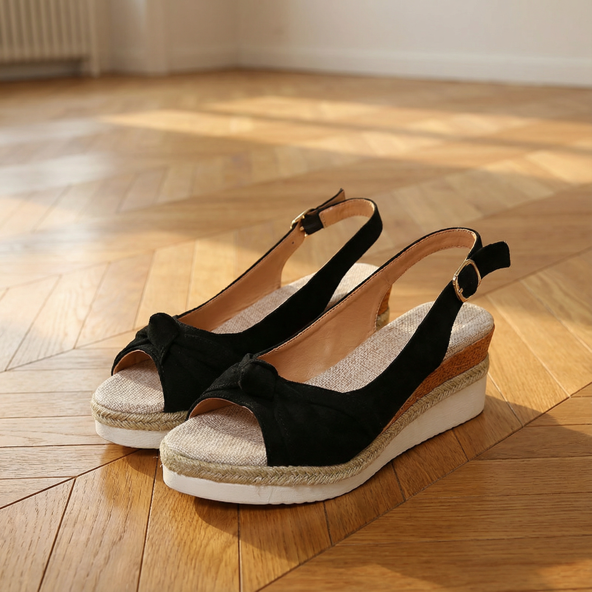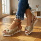 Women's peep toe espadrille wedge sandals with suede upper and adjustable ankle strap with buckle closure. Features open toe design, cushioned insole, and rubber sole with jute trim and platform wedge base. Suitable for casual wear, everyday outfits, or warm weather wear.