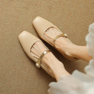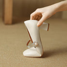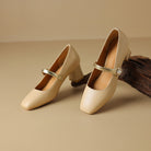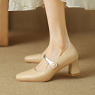 A pearl-accented metallic strap adds a hint of glam to this classy pump shaped with a square toe and structured block heel in nude shades that complement any look.