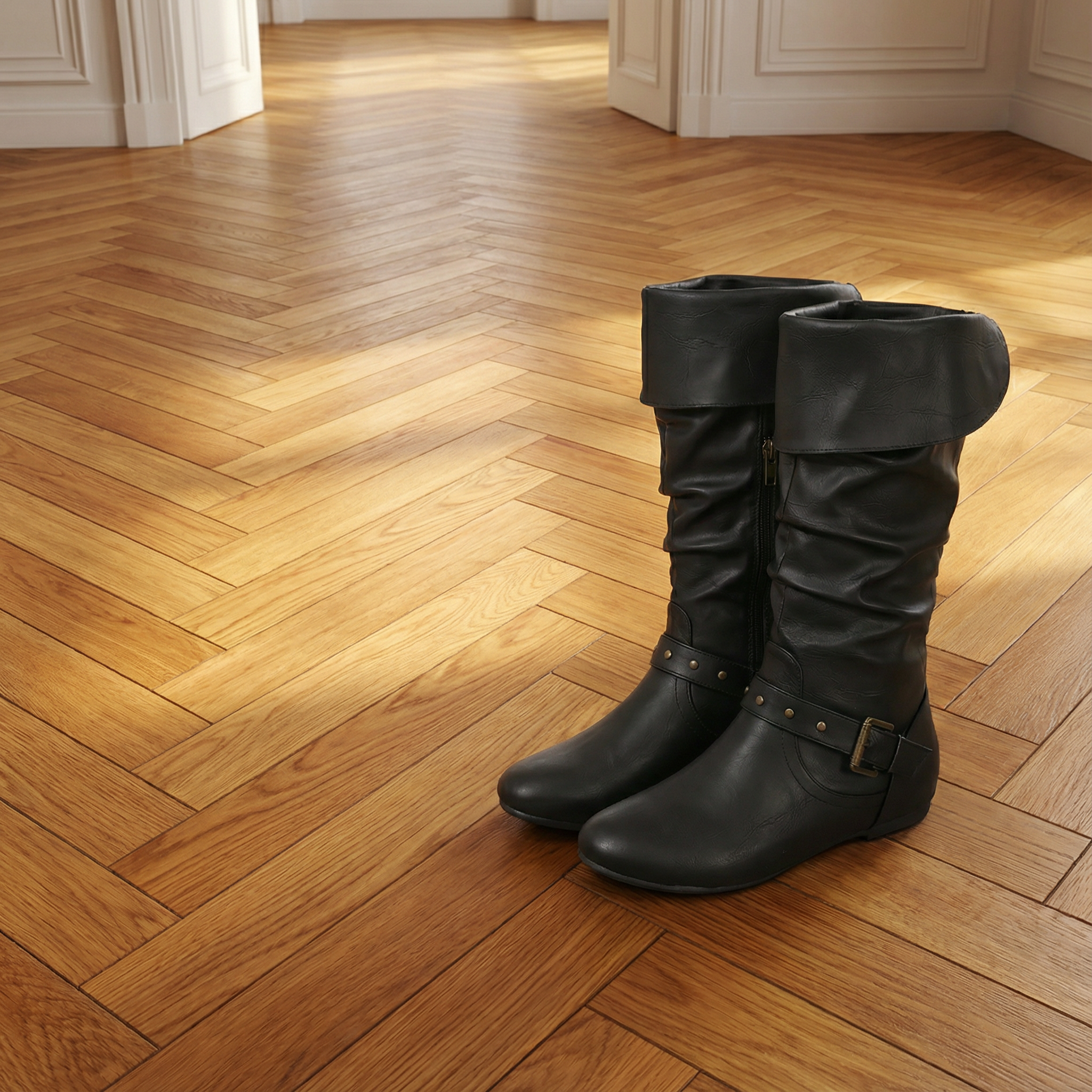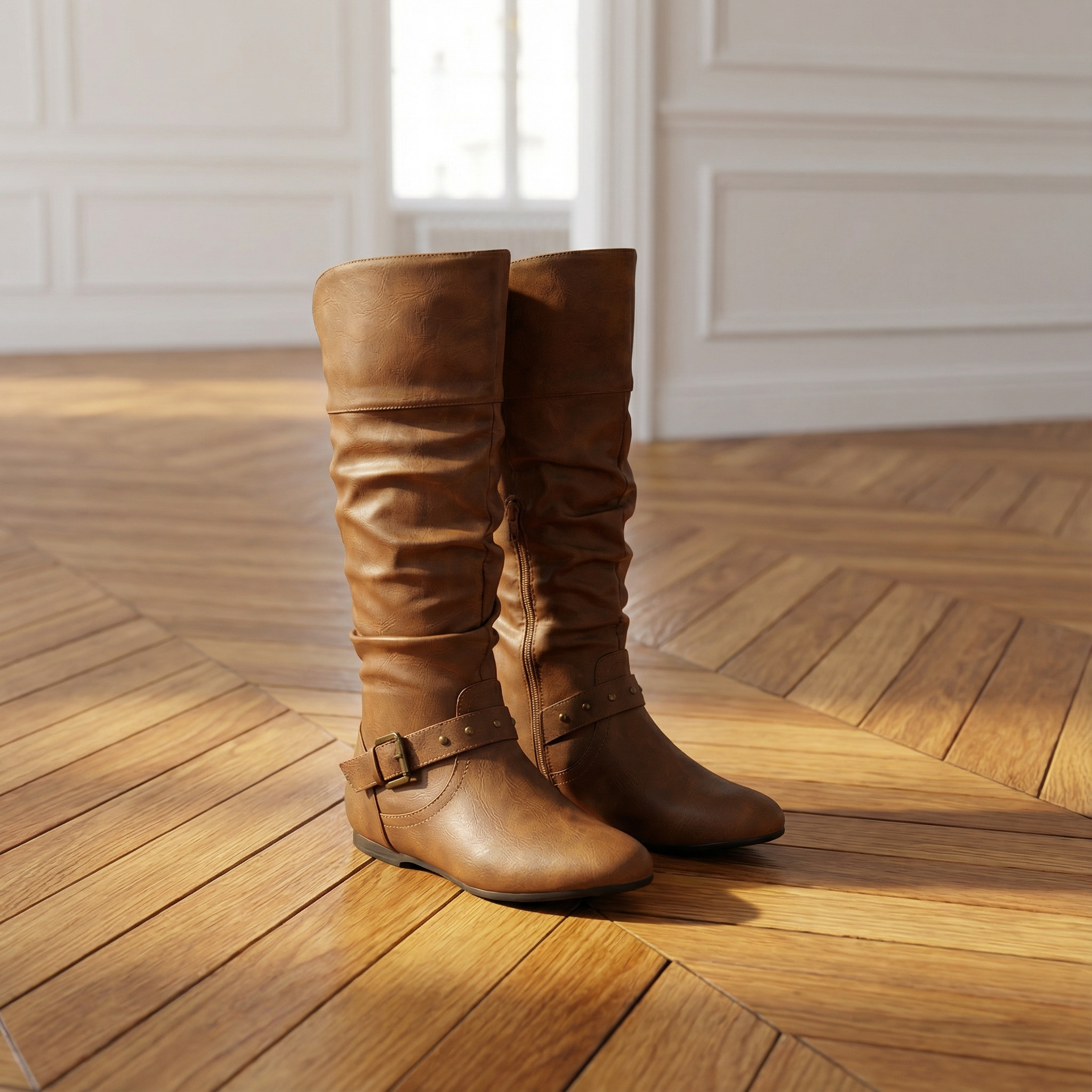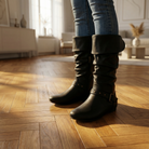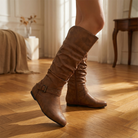 Women's knee-high boots with upper and gathered shaft design. Features side zipper closure, decorative buckle strap accent, round toe, flat sole, and rubber base. Suitable for casual wear, everyday outfits, or dressy occasions.