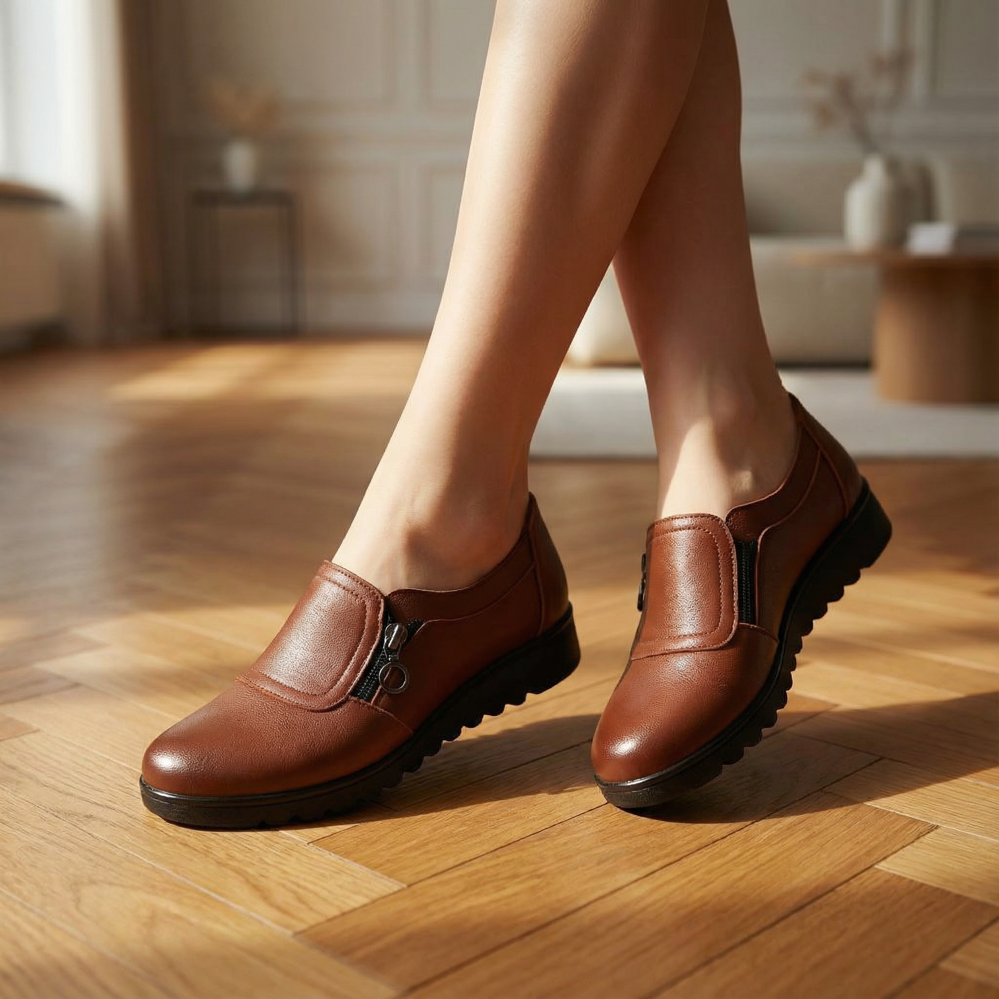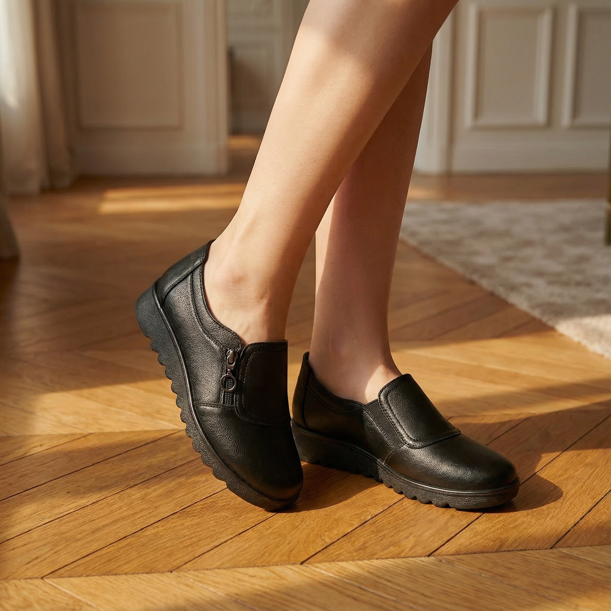 Women's slip-on shoes with upper and side zipper closure. Features round toe, cushioned insole, and rubber sole with platform base. Suitable for casual wear, everyday outfits, or all-season wear.
